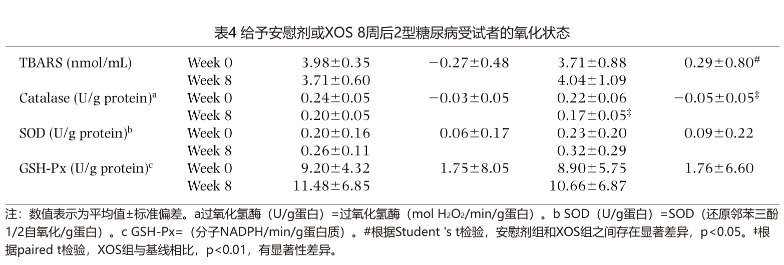 试验设计 实验设计:本研究以台湾台中市退伍军人总医院门诊2型糖尿病患者26例(男19例,女7例)为研究对象,采用双盲、安慰剂对照设计,所有受试者均接受体检和血液检查(包括肝肾功能)。患者无肾脏疾病、心脏病或传染病、胃肠道疾病,过度肥胖(体重指数(BMI)>30)胰岛素和脂质代谢药物治疗,且非吸烟者或抗氧化剂补充剂使用者。糖化血红蛋白(HbA1c)在7.0~10.0%范围内,TG低于400 mg/dL。研究人员要求受试者保持口服降糖药物、饮食习惯和生活方式。向受试者解释本研究的目的和程序,并获得他们的书面同意。XOS组只有一名受试者正在接受饮食治疗,而其他受试者正在服用口服降糖药,在研究开始前没有任何患者开始药物治疗。受试者被随机分配两组,服用4 g/d低聚木糖(XOS)(低聚木糖95P)(n=14)或安慰剂(4 g/d葡萄糖)(n=12)8周。每天的剂量是以装在纸袋里的粉末的形式提供的,病人被要求退回纸袋以评估他们的依从性。病人分两次服用补充剂,一半在早餐时服用,另一半在晚餐时服用。在基线(第0周)和第8周进行抽样收集和测量;计算每个受试者的每个参数的变化。 特性和营养评估:由一位训练有素的营养师对受试者进行面对面的访谈,以评估受试者的特征,包括年龄、性别、身体成分、营养测量和胃肠道(GI)症状。测量身高、体重、体脂等人体测量数据。并采用三维食物回忆法评估膳食摄入量,并根据食物成分表计算营养成分。使用van Munster等人描述的问卷评估8种胃肠道症状。所列症状有:食欲、胃肠道隆隆声、打嗝、肠胃胀气、大便气味、如厕习惯、大便阻力和大便性状,而胃肠不适程度则由无、轻、中到重排列。受试者的空腹静脉血在基线和第8周由医务助理抽取,部分血样经1200×g离心10 min(Hettich Universal 16r,Ger-many)获得血清样品,分析血清胰岛素、果糖胺、甘油三酯、总胆固醇和高密度脂蛋白胆固醇、载脂蛋白A-I、载脂蛋白B、谷氨酸草酰乙酸转氨酶(GOT)水平,谷氨酸丙酮酸转氨酶(GPT)、血尿氮(BUN)、肌酐和SCFA。 氧化状态分析:测定血浆中硫代巴比妥酸反应物(TBARS)浓度和红细胞超氧化物歧化酶(SOD)、过氧化氢酶(CAT)和谷胱甘肽过氧化物酶(GSH-Px)活性,评价受试者的氧化状态;超氧化物歧化酶、过氧化氢酶和谷胱甘肽过氧化物酶的活性数据以单位/克蛋白质表示。采用皮尔斯微量双辛酸(BCA)蛋白测定法测定样品中可溶性蛋白。 SCFA水平分析:测定血清SCFAs水平,包括乙酸、丙酸和丁酸。 试验结果 (1)受试者的特征和营养参数 由表1和表2可知,安慰剂组和XOS组之间的平均年龄和糖尿病持续时间没有差异,而服用XOS 8周后,受试者的葡萄糖、糖化血红蛋白和果糖胺的浓度显著降低。然而,补充XOS不会改变体重、BMI、体脂、胰岛素、GOT、GPT、BUN或肌酐值。 由表3可知,补充XOS 8周后,总胆固醇、低密度脂蛋白胆固醇、氧化低密度脂蛋白和载体蛋白B的值显著下降;然而,XOS补充剂并不影响2型DM受试者的空腹血清短链脂肪酸。上述结果表明,以4 g/d的浓度补充XOS 8周,可以降低2型DM受试者的血糖和血脂水平。