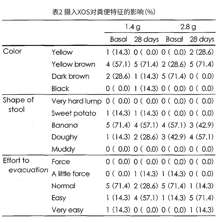 如表2所示,2.8 g组大便颜色由深褐色变为黄褐色。排便困难程度方面,1.4 g组有5人在摄入XOS前“正常”,而在摄入XOS后有4人“正常”,2人“容易”;在2.8 g组中,摄入XOS后,在回答“正常”的组中,有4个“容易”和1个“非常容易”。
