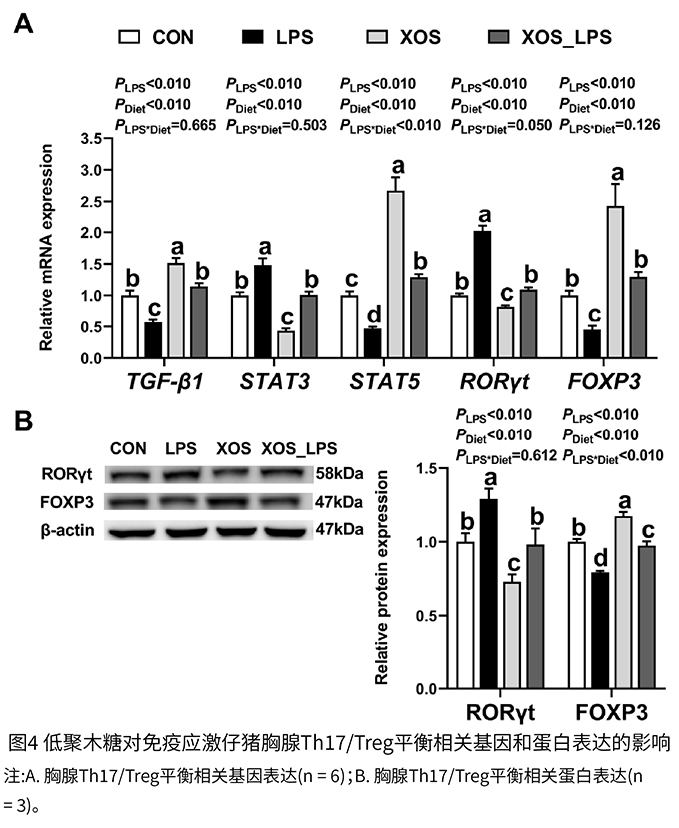(3)低聚木糖对免疫应激仔猪回肠及胸腺Th1 7/Treg平衡相关基因和蛋白的影响 低聚木糖对免疫应激仔猪回肠和胸腺Th17/Treg平衡相关基因和蛋白的影响见图3和图4。与CON组相比,XOS组显著提高了回肠和胸腺中TGF-β1、FOXP3和STAT5的mRNA表达及FOXP3的蛋白表达(P < 0.05);显著降低了RORγt和STAT3的mRNA表达水平及RORγt的蛋白表达水平(P < 0.05)。与CON组相比,LPS组显著降低了回肠和胸腺中TGF-β1、FOXP3和STAT5的mRNA表达水平及FOXP3的蛋白表达水平(P < 0.05);显著提高了RORγt和STAT3的mRNA表达水平及RORγt的蛋白表达水平(P < 0.05)。 在LPS处理下,日粮添加低聚木糖抑制了LPS造成的影响,表现为回肠和胸腺中TGF-β1、FOXP3和STAT5的mRNA表达水平及FOXP3的蛋白表达水平升高(P < 0.05);RORγt和STAT3的mRNA表达水平及RORγt的蛋白表达水平降低(P < 0.05)。低聚木糖和LPS对回肠TGF-β1、STAT5和RORγt的基因表达、回肠和胸腺FOXP3的蛋白表达和胸腺STAT5的基因表达的影响存在交互作用(P < 0.05)。