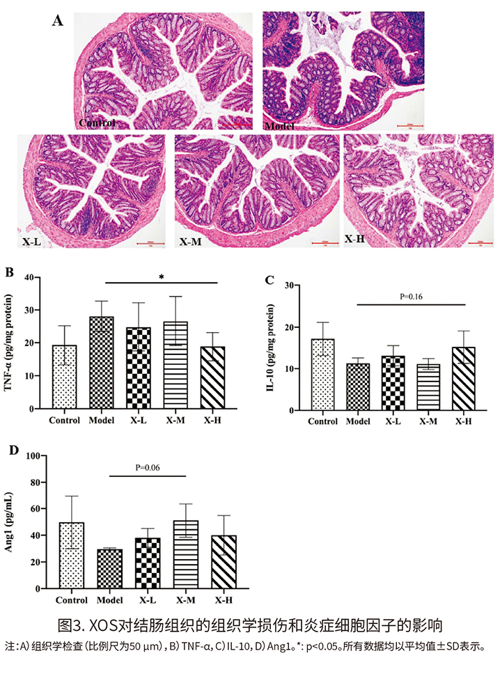 (2)XOS对结肠组织的组织病理学和炎症细胞因子的影响 如图3A所示,在对照组的结肠组织中,没有糜烂和溃疡的形成,隐窝结构正常且相对完整。但是,有大量的炎症细胞浸润和肠绒毛结构损伤。模型组的病理炎症程度显著高于对照组。重要的是,XOS治疗后,肠绒毛结构的损伤程度和免疫细胞的浸润都得到了改善。 如图3B-3D所示,与对照组相比,模型组的TNF-α有所增加。模型组的TNF-α增加了45.70%。图3B显示,XOS的干预可以抑制TNF-α的浓度,尤其是1.00 mg g-1 BW day-1的XOS处理。图3C显示,模型组的抗炎因子IL-10比对照组减少了34.30%,而1.00 mg g-1 BW day-1 XOS处理后,IL-10的浓度增加了34.80%。此外,图3D显示,与对照组相比,模型组的Ang1下降,而0.50 mg g-1 BW day-1 XOS处理后,Ang1的浓度显著增加41.67%。