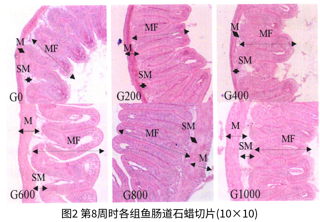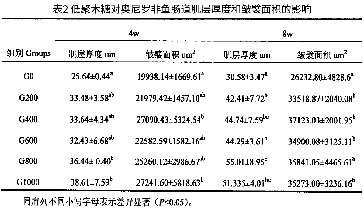 试验结果 (1)饲料中添加低聚木糖对奥尼罗非鱼肠道形态结构的影响 从图1和图2石蜡切片结果可见,第4周和8周时对照组奥尼罗非鱼肠道形态无明显变化,而添加组肠道形态发生明显变化:肠道黏膜皱襞完整、高度较大,皱襞面积较大,黏膜上皮细胞核排列整齐,肌层变厚,各组肠道肌层厚度和皱襞面积见表2所示,第4周时G800组和G1000组肌层厚度显著高于对照组(P<0.05),G400组和G1000组皱襞面积显著高于对照组(P<0.05)。第8周时,各添加组肌层厚度均显著高于对照组(P<0.05),G800组显著高于其他各组(P<0.05),各添加组皱襞面积均显著高于对照组(P<0.05)。
