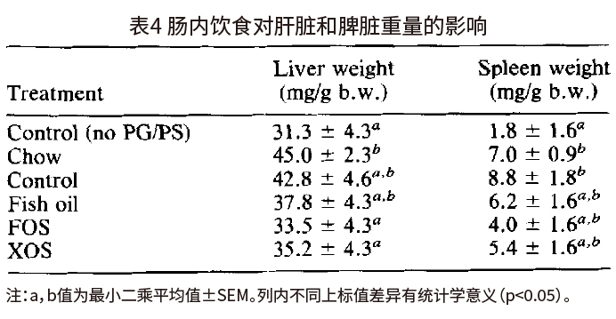 (4)饮食对PG/PS诱导的肝脏和脾脏重量的影响 如表4所示,与Chow组相比,XOS组显著降低了PG/PS引起的肝脏重量增加。 ![]() 试验结论 本文研究了益生元低聚木糖(XOS)对肽聚糖-多糖(PG/PS)诱导的特异性无病原体的雌性Lewis大鼠的结肠炎的影响,结肠组织学分析表明,补充XOS可抑制炎症细胞产生,与结肠炎动物相比,XOS显著减弱了PG/PS诱导的结肠重量增加、结肠髓过氧化物酶(MPO)活性增加和肝脏重量增加,表现出与已知抗炎药物柳氮磺吡啶(SAZ)类似的抗炎活性。以上结果表明,补充XOS的肠内饮食可通过抑制炎症细胞产生,降低结肠重量、结肠MPO活性和肝脏重量,减轻大鼠慢性结肠炎。 参考资料: Grisham M B, Demichele S J, Garleb K A, et al. Sulfasalazine or enteral diets containing fish oil or oligosaccharides attenuate chronic colitis in rats[J].Inflammatory Bowel Diseases, 1996, 2(3):178-188. |