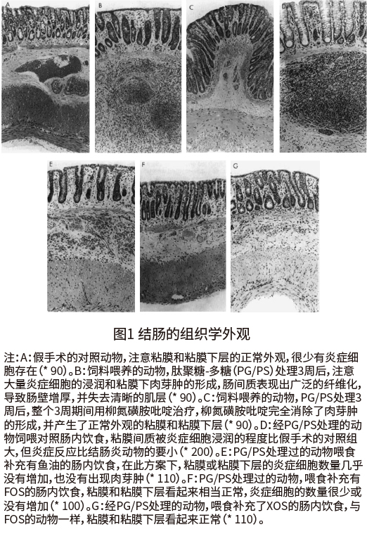 试验设计 采用特异性无病原体的雌性Lewis大鼠(175~200 g)作为试验研究对象,第一组试验,将大鼠随机分为3组,Sham chow组(假手术对照组,n=10)、PG/PS chow组(结肠炎组,n=29)和SAZ组(在诱导结肠炎后立即在其饮水中给予柳氮磺吡啶(SAZ)的组(100 mg/kg/d,n=8),通过注射纯化肽聚糖-多糖(PG/PS)诱导结肠炎;第二组试验,将大鼠随机分为6组,Control(No PG/PS)组(喂食对照饮食的假手术组,n=7)、Chow组(喂食饲料的结肠炎组n=29),以及喂食肠内饮食的四个结肠炎组,如表1和表2所示,Control组(肠内饮食,n=7)、Fish Oil组(补充FO的肠内饮食,n=8)、FOS组(补充FOS的肠内饮食,n=8)和XOS组(补充XOS的肠内饮食,n=8)。所有大鼠在结肠炎诱导前接受1周饲喂,随后再接受3周饲料或肠内配方。实验为期4周,包括诱导前和注射后。日采食量和体重每24小时记录一次。标准大鼠实验室饲料包括22%的蛋白质、5%的脂肪和4.5%的纤维。