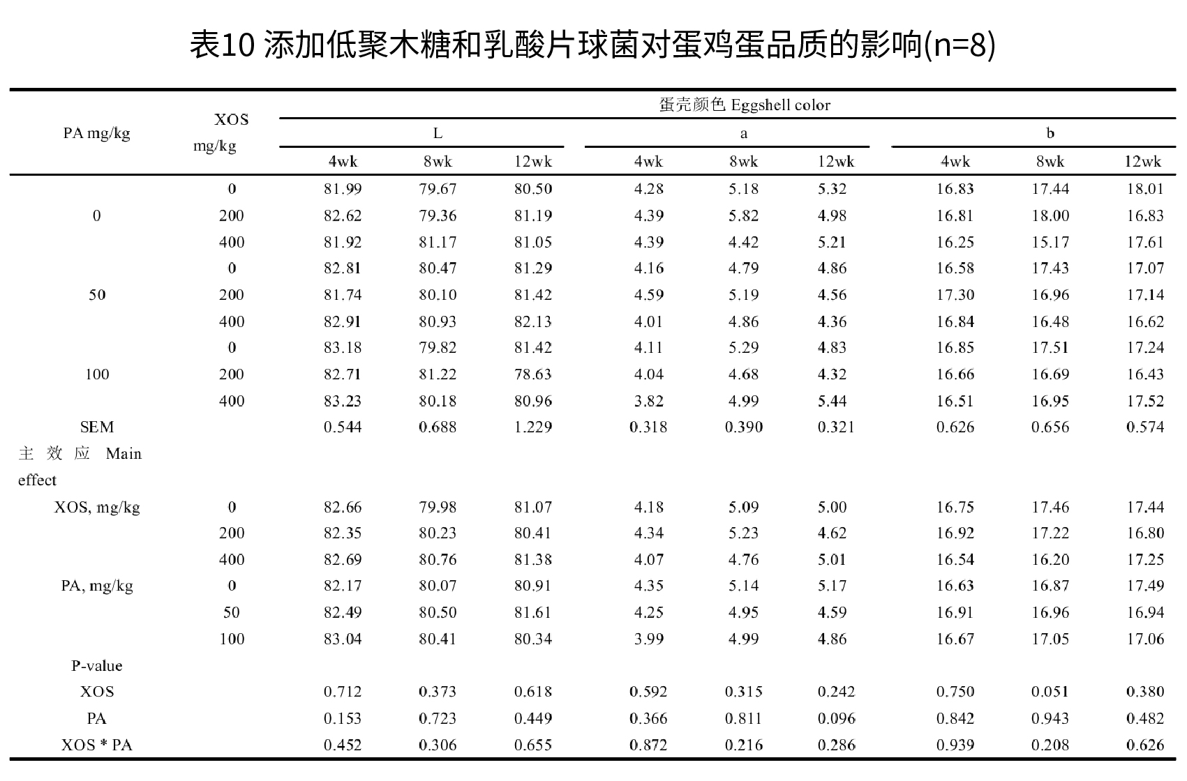 (2)添加低聚木糖和乳酸片球菌对蛋鸡蛋品质的影响 添加XOS和PA对蛋鸡蛋品质的影响见表7、8、9和10。 结果表明,试验第4周时,添加不同水平XOS和PA在蛋黄颜色和蛋黄指数有交互作用(P≤0.03),在蛋黄颜色上,PA 50 mg/kg和XOS 200、400 mg/kg联用及PA 100 mg/kg和XOS 400 mg/kg联用与单独添加PA 100 mg/kg相比显著提高;在蛋黄指数上,单独添加XOS 200、400 mg/kg和单独添加PA 50、100mg/kg均显著提高,但联用组体现出进一步提高。从主效应看,添加XOS 400 mg/kg有提高蛋黄颜色趋势(P=0.054)。 试验第12周时,添加不同水平XOS和PA在蛋白高度、哈氏单位和蛋黄颜色上具有交互效应(P<0.05)。在蛋白高度和哈氏单位,以单独添加XOS 400 mg/kg最高。