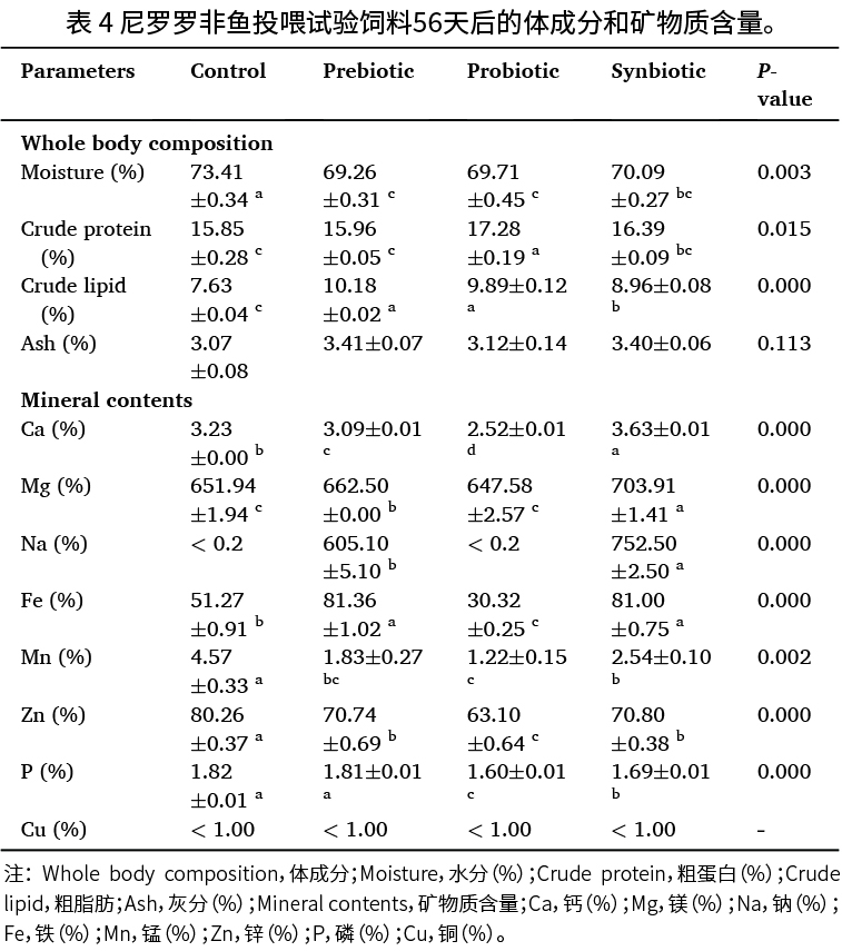 (3)低聚木糖对尼罗罗非鱼体成分与矿物质的影响 如表 4 所示,全鱼体水分含量在 69.26%~73.41% 之间,其中XOS组鱼类粗脂肪含量和钙(Ca)、镁(Mg)、钠(Na)、铁(Fe)含量均为最高(P < 0.05)。