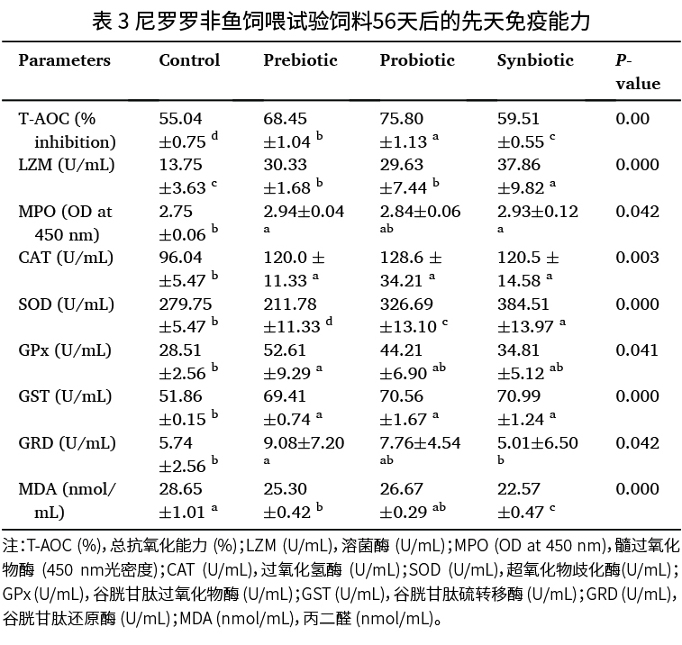 (2)低聚木糖对尼罗罗非鱼先天免疫能力的影响 如表 3 所示,与对照组相比,XOS组显著提高了尼罗罗非鱼的血清总抗氧化能力(TAOC)、也显著提高了血清中溶菌酶(LZM)、过氧化氢酶(CAT)、谷胱甘肽 S - 转移酶(GST)、髓过氧化物酶(MPO)、谷胱甘肽过氧化物酶(GPx)及谷胱甘肽还原酶(GRD)的活性(P < 0.05)。