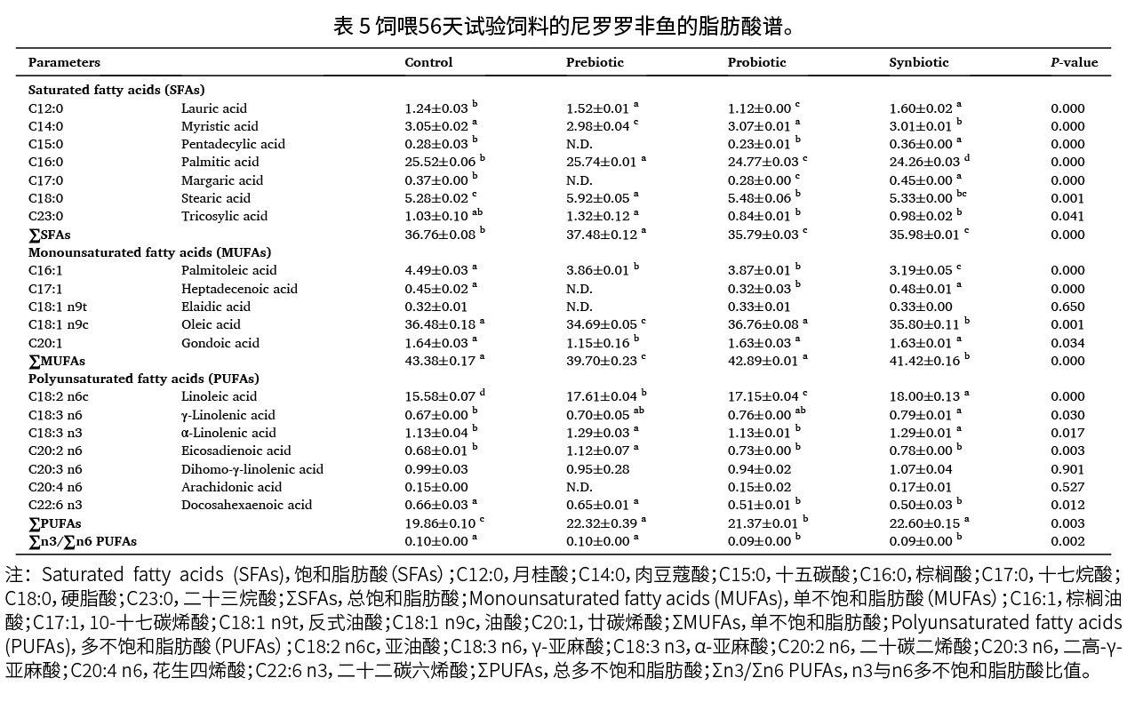 (4)低聚木糖对尼罗罗非鱼肉脂肪酸含量的影响 如表 5 所示,XOS组鱼体总饱和脂肪酸(SFA)及月桂酸(十二烷酸)、棕榈酸、硬脂酸(十八烷酸)、二十三烷酸含量均显著升高(P<0.05);同时,该组总单不饱和脂肪酸(MUFA)含量显著降低,总多不饱和脂肪酸(PUFA)含量显著提高(P < 0.05)。
