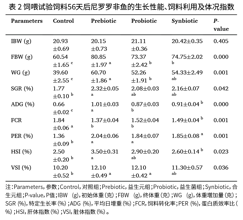 试验结果 (1)低聚木糖对尼罗罗非鱼生长性能与体况指数的影响 如表2所示,与对照组鱼类相比,XOS组显著提高了尼罗罗非鱼的蛋白质效率(PER)、终末体重(FBW)、增重率(WG)、特定生长率(SGR)、平均日增重(ADG)和肝体指数(HSI),并同时显著降低了饲料比(FCR)(P<0.05)。