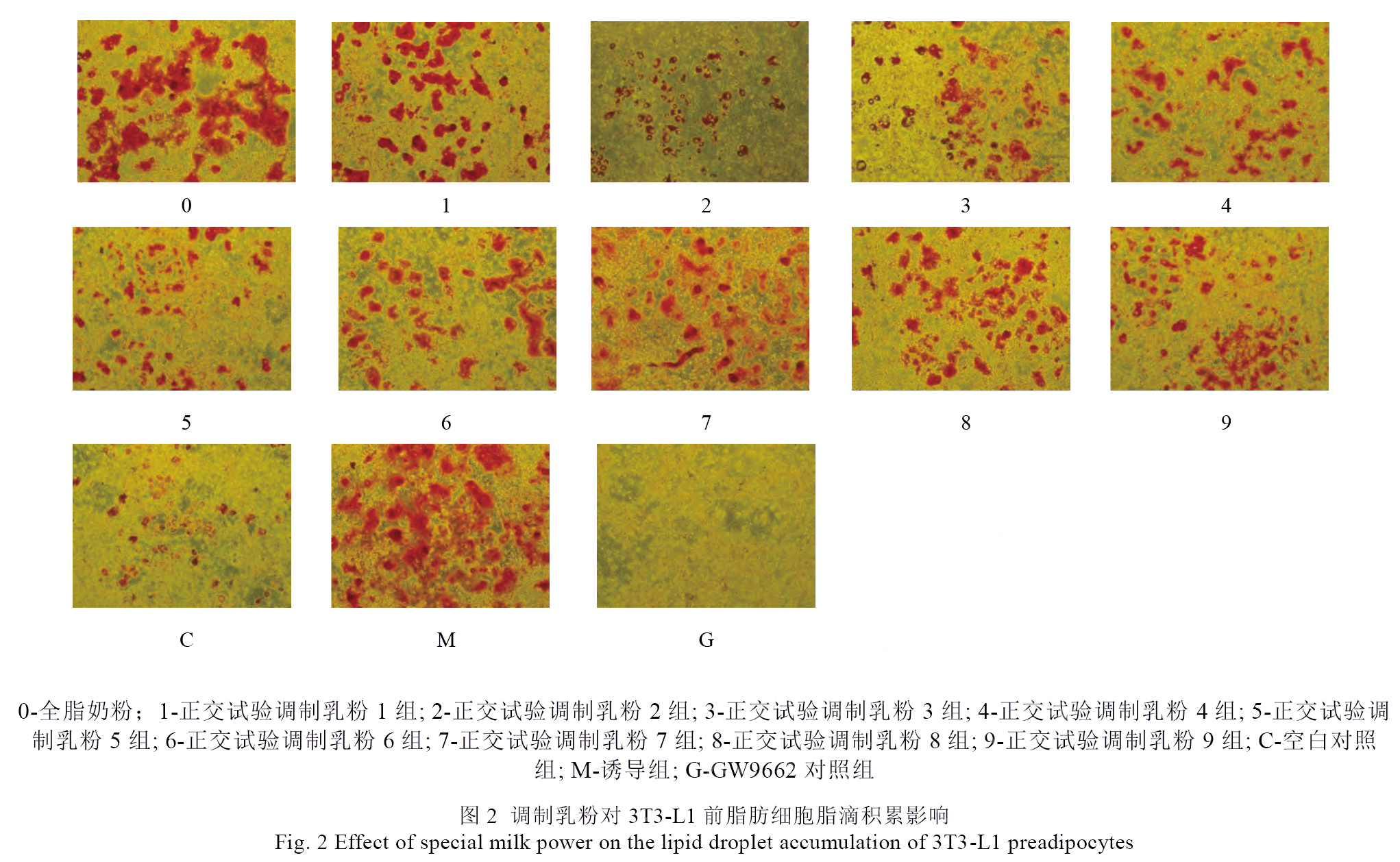 调制乳粉配方(以30 g计)各组分添加量为:乳固体添加量21.6 g(全脂奶粉添加量 18.0 g、乳清蛋白添加量3.6 g)、低聚木糖添加量0.6 g、不饱和脂肪酸添加量6.6 g(共轭亚油酸甘油酯微囊粉添加量2.3455 g、亚麻籽油微囊粉添加量4.2545 g)、麦芽糊精添加量1.2 g时,所制得的调制乳粉呈乳黄色、冲调性较好、具有浓郁乳香味,蛋白质含量、脂肪含量、复原乳酸度、杂质度、水分含量均符合GB 19644—2010 乳粉对调制乳粉的要求,且感官品质符合国标要求,与全脂奶粉相比调制乳粉可显著降低 3T3-L1 前脂肪细胞脂滴面积(P<0.05),对脂肪细胞增殖有抑制效果。