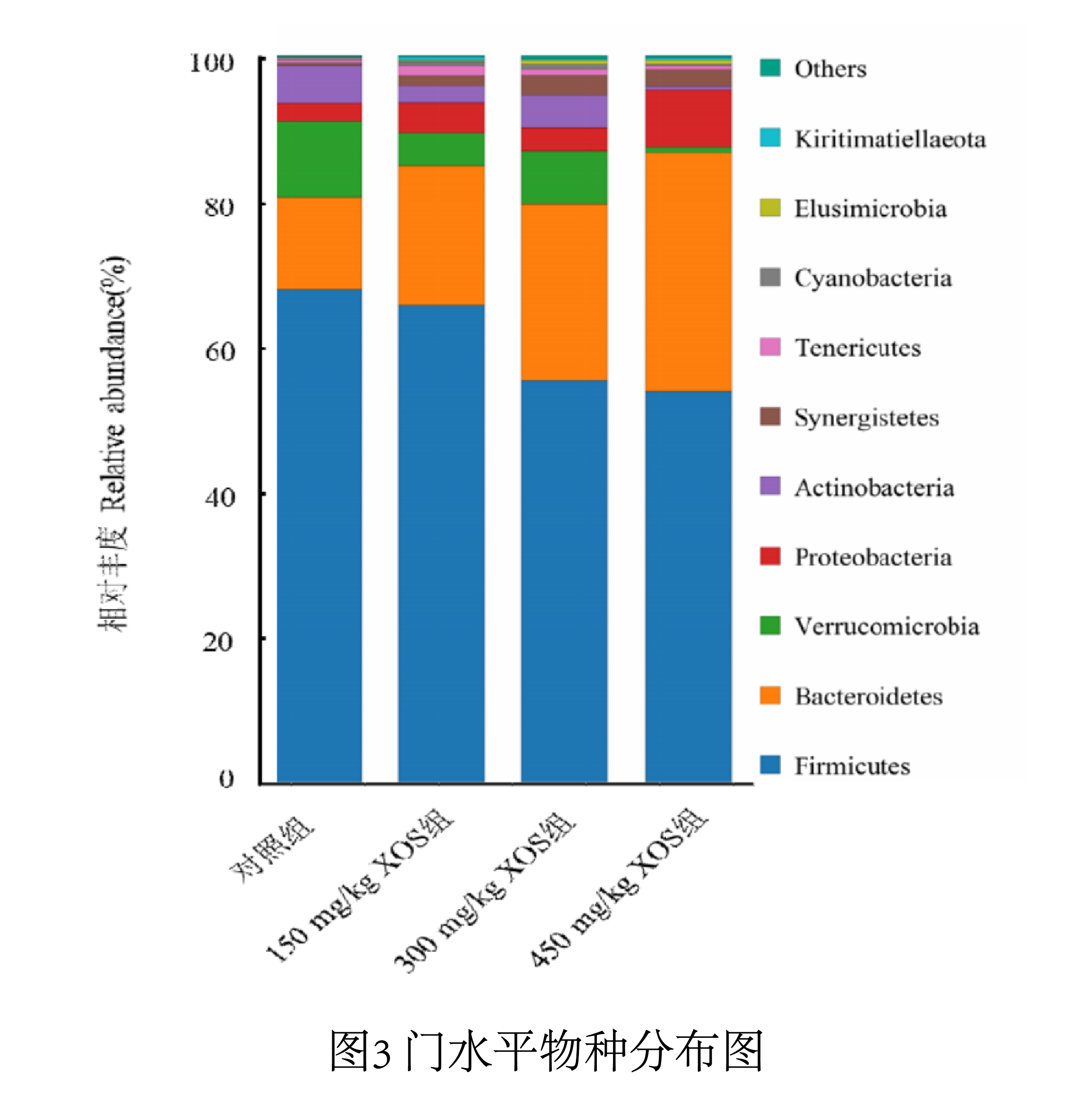 盲肠微生物菌群OTU水平Veen图分析:Venn图是选用相似性97%以上的OTU进行分析,可以看出组间共有和特有物种数目。如图1所示,本试验共检测到605个OTU,其中共有549个OTUs,150 mg/kg XOS组和450 mg/kg XOS组特有2个 OTUs,300 mg/kg XOS组特有3个OTUs。 盲肠微生物Alpha多样性:由表6所示,与对照组相比,150 mg/kg XOS组和300 mg/kg XOS组的Ace指数和Chao1指数显著增加(P<0.05),肉鸡盲肠微生物的Ace指数、Chao1指数随XOS添加水平增加呈二次显著增加(P<0.05),XOS各试验组的Shannon指数显著增加(P<0.05)。