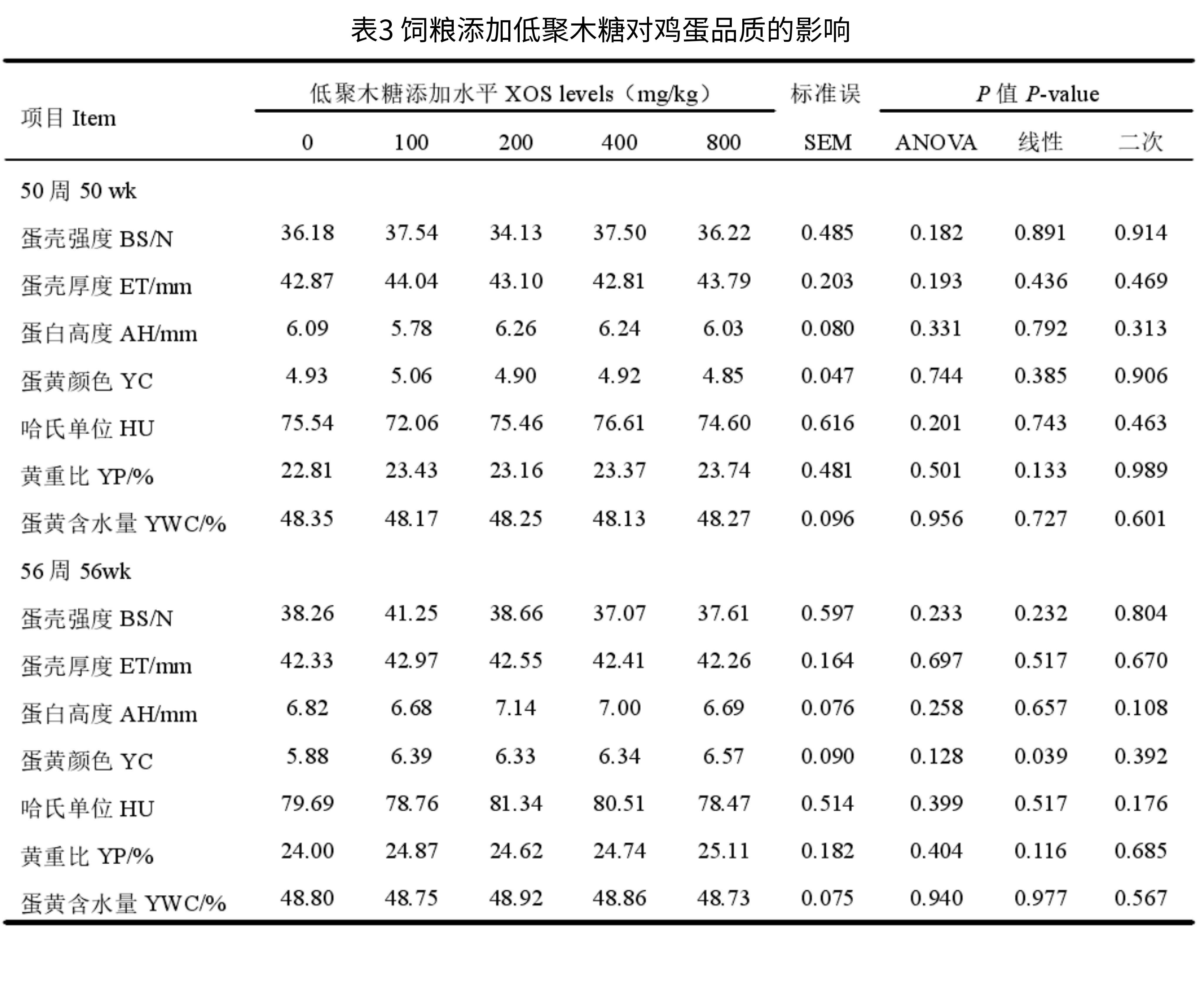 (2)饲粮添加低聚木糖对鸡蛋品质的影响 低聚木糖对于鸡蛋品质的影响见于表3。由表可知,饲粮添加低聚木糖线性提高了试验期末蛋黄颜色评分(P<0.05)。