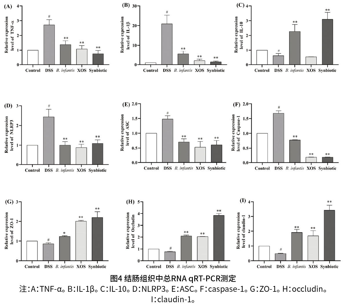 (5)B. infantis、XOS和合生制剂对NLRP3炎症小体mRNA表达水平的影响 如图4(D、E、F)所示,与Control组相比,DSS组的结肠NLRP3、ASC和caspase1 mRNA表达水平明显增加;然而,B. infantis组、XOS组和Synbiotic组显著地降低了NLRP3、ASC和caspase-1 mRNA的表达水平。 (6)B. infantis、XOS和合生制剂对ZO-1、occludin和claudin-1 mRNA表达水平的影响 如图4(G、H、I)所示,与Control组相比,DSS组的ZO-1、occludin和claudin-1的mRNA表达水平明显下调;然而,B. infantis组、XOS组和Synbiotic组明显提高了ZO-1、occludin和claudin-1 mRNA的表达水平,且这三个TJ分子的mRNA表达水平的增加在Synbiotic组最高,其次是B. infantis组、XOS组。 试验结论 本文研究了含B. infantis和XOS的合生制剂对小鼠溃疡性结肠炎模型的结肠炎症的影响,通过DAI评估和评级,B. infantis组、XOS组和Synbiotic组都能有效地降低DAI评分和病理评分,表明其在减轻结肠炎严重程度方面具有明显优势,且Synbiotic治疗比单独使用B. infantis或XOS更有效;在结肠组织中,所有治疗组都明显抑制了氧化应激;与DSS诱导的结肠炎组相比,所有治疗组都显著降低了结肠组织中的促炎细胞因子TNF-α和IL-1β,而Synbiotic组显著提高了抗炎细胞因子IL-10;分离结肠组织中的总RNA,通过qRT-PCR分析,所有治疗组都明显降低了结肠组织中NLR家族含pyrin结构域3(NLRP3)炎症体的mRNA水平,并增加了结肠组织中的ZO-1、occludin和claudin-1 mRNA的表达水平。以上结果表明,Synbiotic对结肠炎的作用可能是由益生菌和益生元成分的直接抗炎作用以及它们强化结肠上皮屏障完整性的能力的叠加的结果。 参考资料: Kangliang Sheng, Shiman He, Ming Sun, et al. Synbiotic supplementation containing Bifidobacterium infantis and xylooligosaccharides alleviates dextran sulfate sodium-induced ulcerative colitis[J].Food & function. 2020, 11(5):3964-3974. |