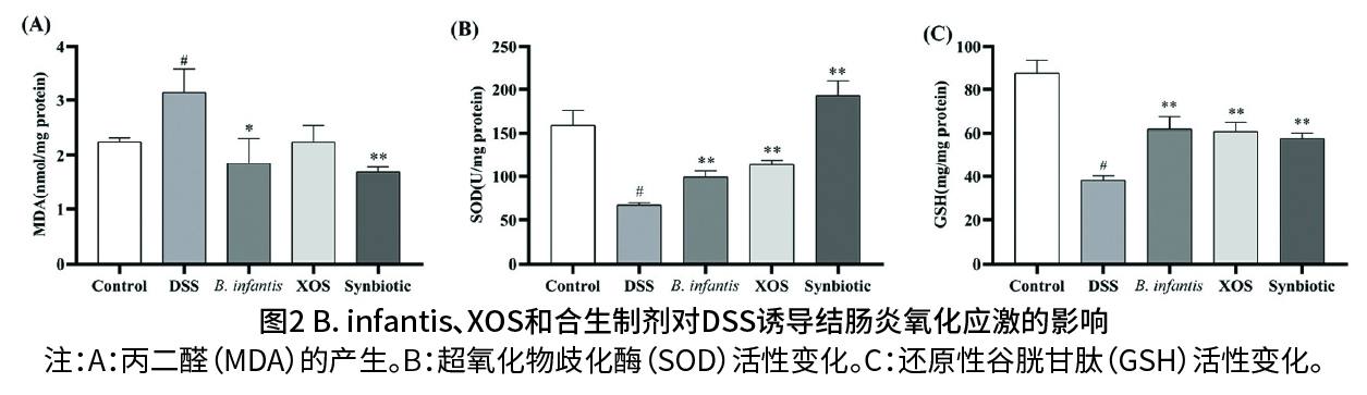 (2)B. infantis、XOS和合生制剂对氧化应激的影响 如图2所示,与Control组相比,DSS组的MDA水平较高,SOD和GSH活性水平较低,与DSS组相比,B. infantis组、XOS组和Synbiotic组的结肠MDA水平显著降低,结肠SOD和GSH活性显著增加。