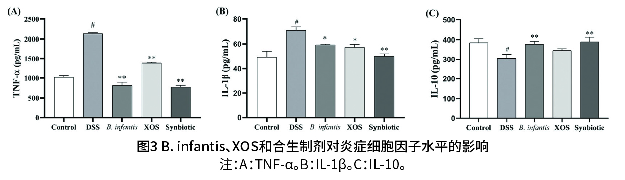 (3)B. infantis、XOS和合生制剂对炎症细胞因子水平的影响 如图3所示,与DSS组相比,B. infantis组、XOS组和Synbiotic组的结肠炎症细胞因子(TNF-α和IL-1β)水平显著降低,Synbiotic组的结肠TNF-α水平最低,Synbiotic组对结肠IL-1β水平增加的抑制作用明显高于B. infantis组和XOS组;与Control组相比,DSS组的结肠IL-10水平显著降低,B. infantis组和Synbiotic组显著逆转了结肠IL-10的下降。