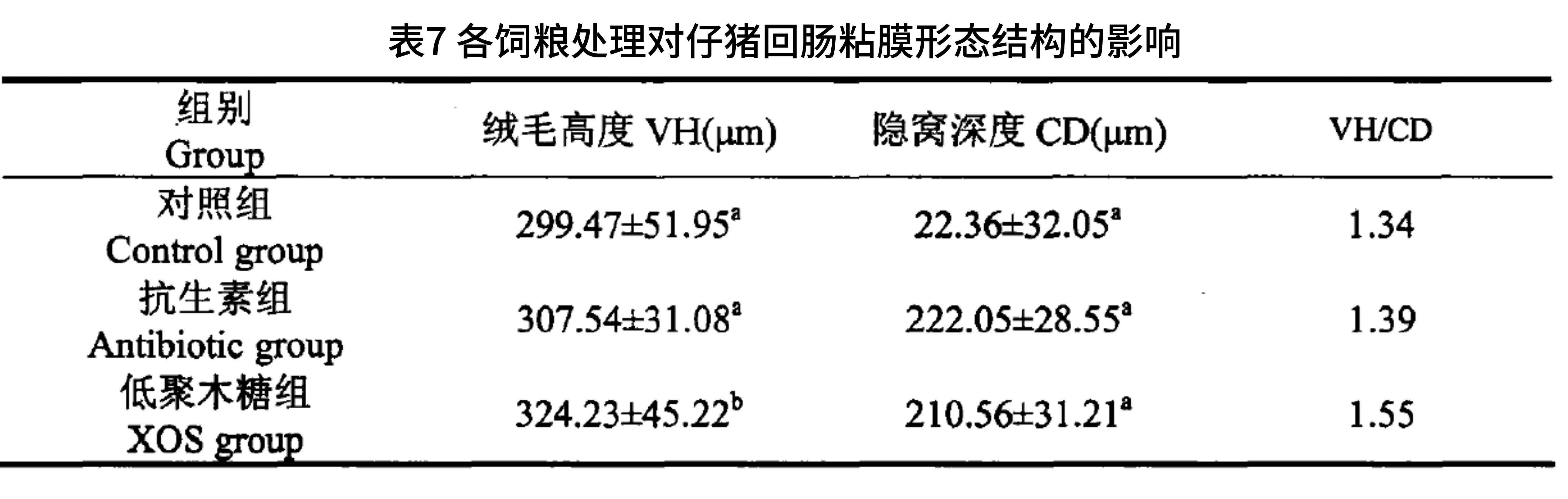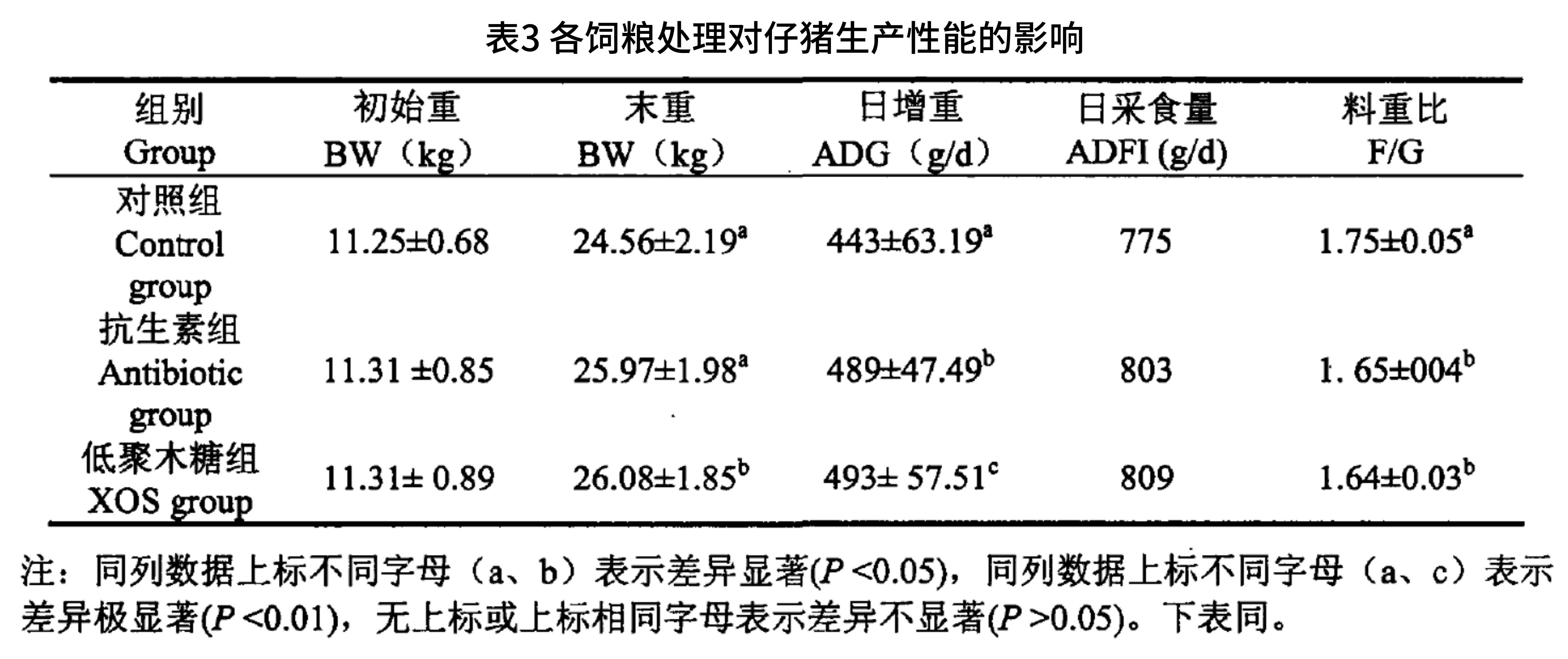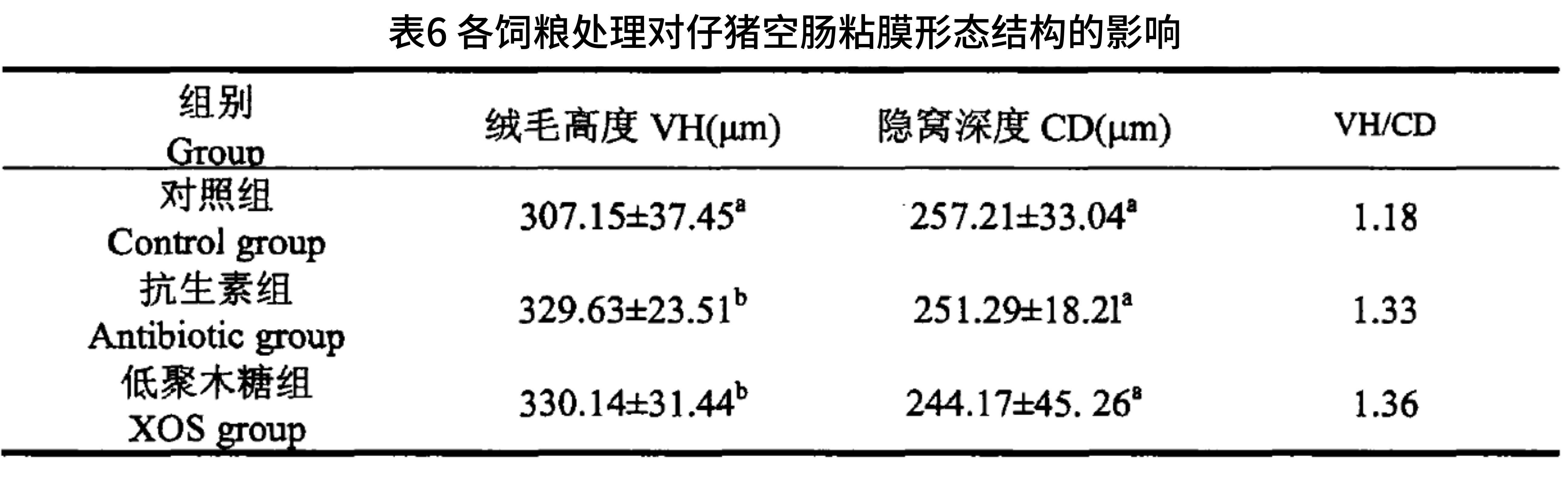 试验结论 饲粮中添加 0.02% 的低聚木糖,对仔猪生长性能和胃肠道发育的促进作用与添加抗生素(粘杆菌素)没有差异。 参考文献: 易海秋.低聚木糖对仔猪生长性能的影响研究[D].湖南农业大学,2016. |