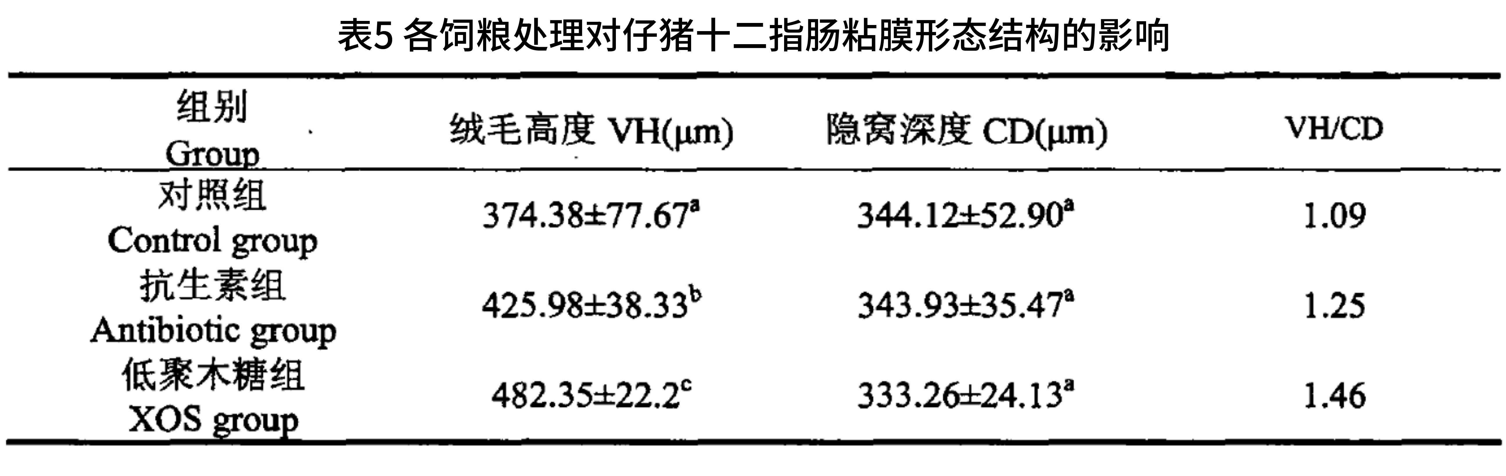 (3)低聚木糖对仔猪肠道粘膜形态结构的影响 由表5-7可见,抗生素组和低聚木糖组各肠段的绒毛高度比对照组均有所提高。其中,低聚木糖组十二指肠绒毛高度比对照组极显著高出29%(P<0.01),显著高于抗生素组(P<0.05)。低聚木糖组空肠绒毛高度显著高于对照组(P<0.05),与抗生素组无差异(P>0.05)。低聚木糖组回肠绒毛高度显著高于对照组和抗生素组(P<0.05)。
