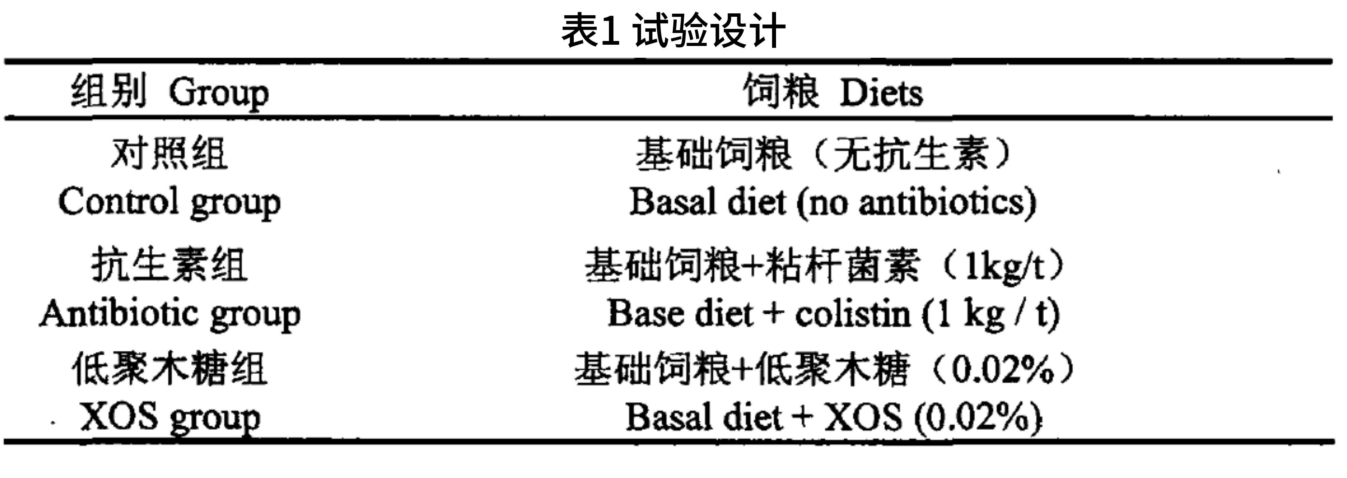 试验目的 本试验以仔猪为研究对象,探索如何替代饲粮中抗生素,为更好的利用低聚木糖提供理论依据。 试验设计 选择 90 头 11kg 左右外三元(杜×长×大)仔猪,根据体重相近和公母各半原则,随机分成 3 个处理,每个处理有 5 个重复,每重复有 6 头猪,每重复仔猪初始体重无差异(p>0.05)。本试验采用单因子完全随机设计,详见表1。低聚木糖有效含量≥35%。粘杆菌素含量≥15%。基础饲粮组成和营养水平详见表2。抗生素组添加 1kg/t 粘杆菌素,试验组中低聚木糖添加量为 0.02%;试验饲粮均压制成颗粒。