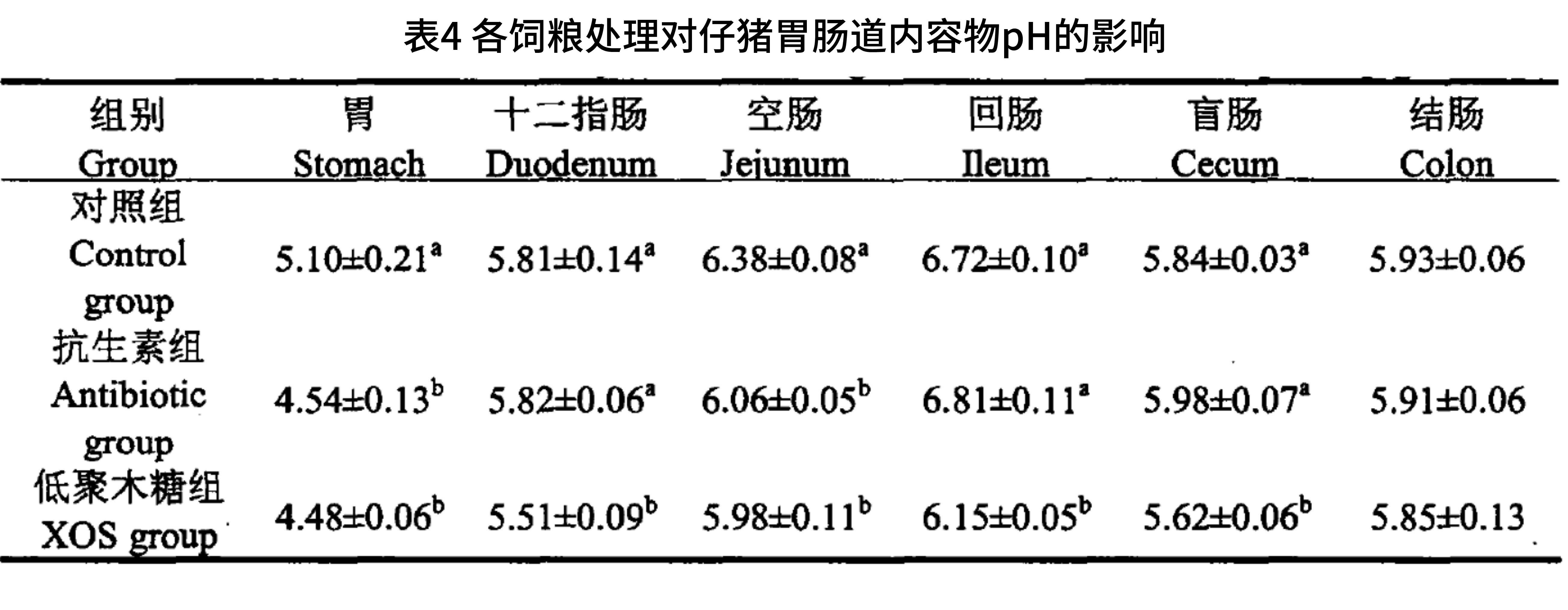 (2)低聚木糖对仔猪胃肠道内容物 pH 的影响 由表4可知,与对照组相比,抗生素组和低聚木糖组胃和各肠段内容物的pH均有不同程度的降低。低聚木糖组十二指肠、回肠和盲肠的pH值显著低于对照组和抗生素组(P<0.05)。低聚木糖组和抗生素组之间的胃和空肠pH值无显著差异(P>0.05),但显著低于对照组(P<0.05)。