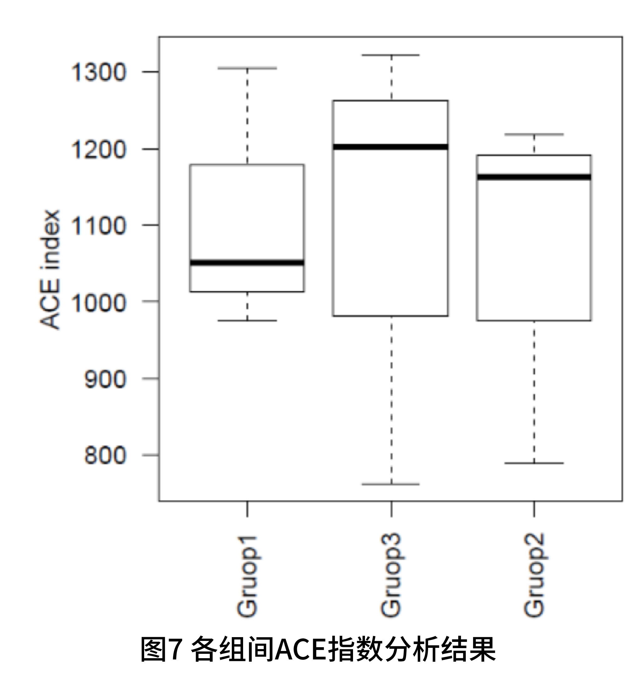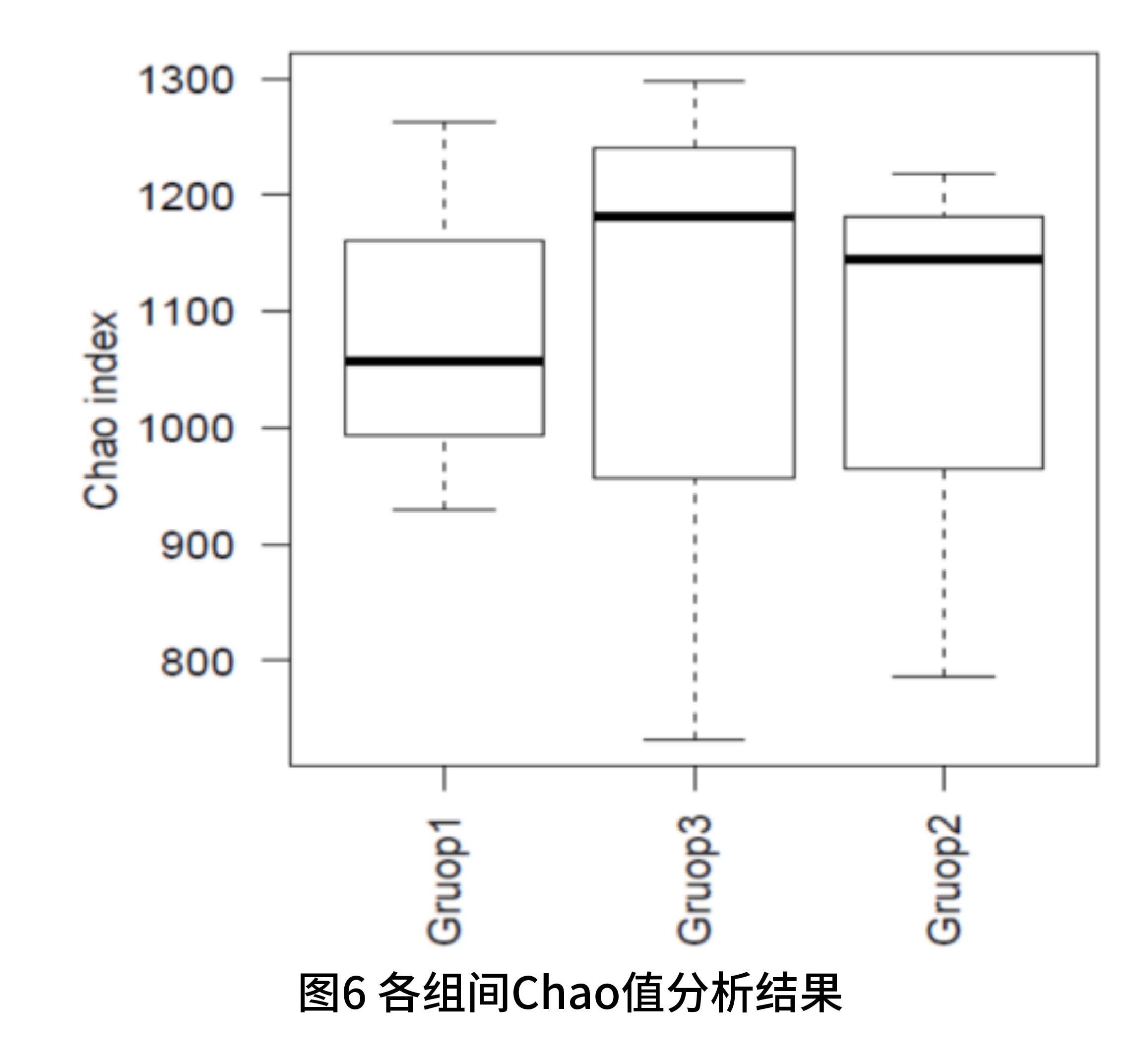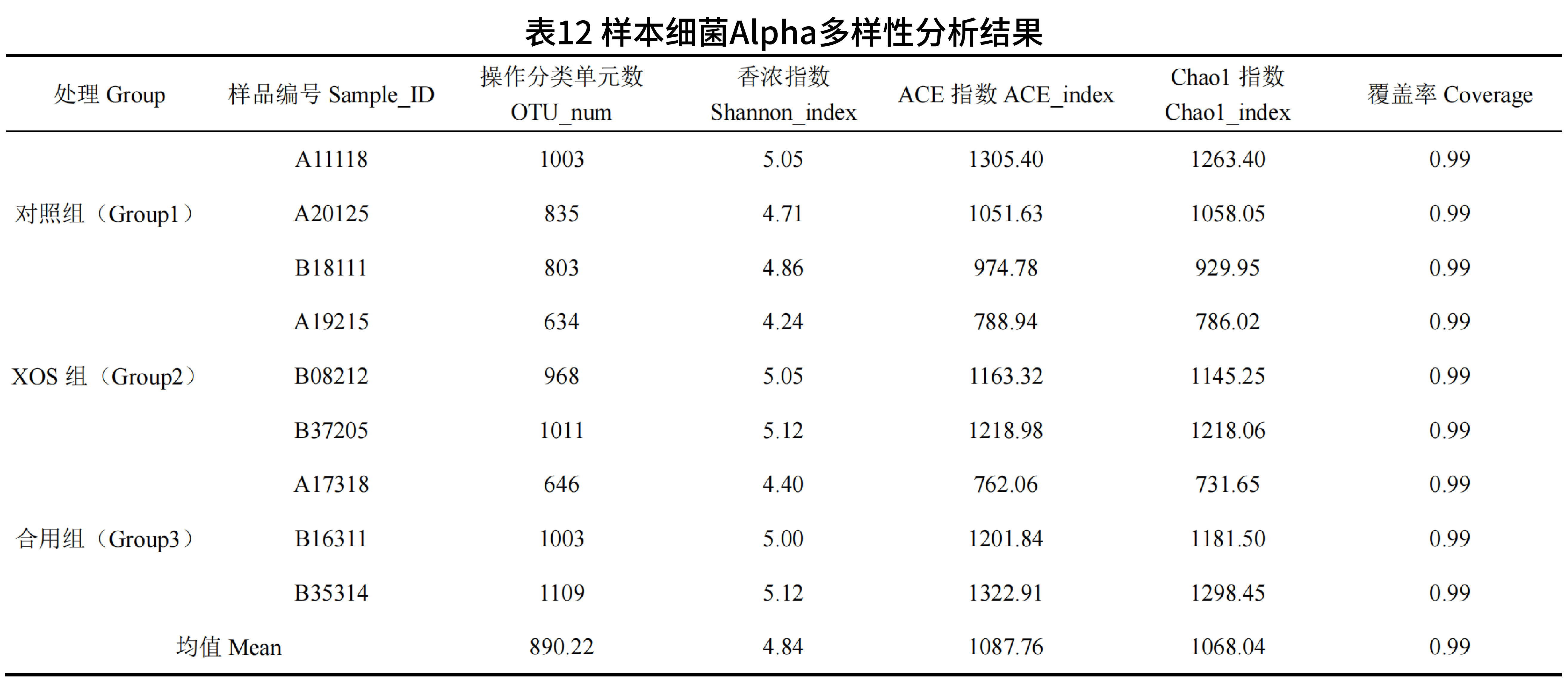 物种Alpha多样性分析:生境内的多样性即Alpha多样性,主要关注局部区域均匀生境下的物种数目,母猪粪便样本Alpha多样性计算结果见表12。将各组Shannon值、Chao值、ACE值用GraphPhlAn V0.9.7软件绘图分析结果见图5、图6、图7。 根据GraphPhlAn V0.9.7软件绘图分析结果:(1)Shannon均值:XOS组(Group2)>合用组(Group3)>对照组(Group1);(2)Chao值:合用组(Group3)> XOS组(Group2)>对照组(Group1);(3)ACE值:合用组(Group3)> XOS组(Group2)>对照组(Group1)。 结果表明,所建立细菌文库的覆盖率均可达到99%,说明试验所建立的文库可比较真实有效地反映样本环境细菌多样性,具有研究意义和实用价值。样本平均香浓指数大于4.8,说明母猪粪便细菌群落多样性较高。不同样本之间生物多样性指数(OTU数、Shannon指数、Chao指数和ACE 指数)越相近,说明3个处理组样本生物多样性差异越小。