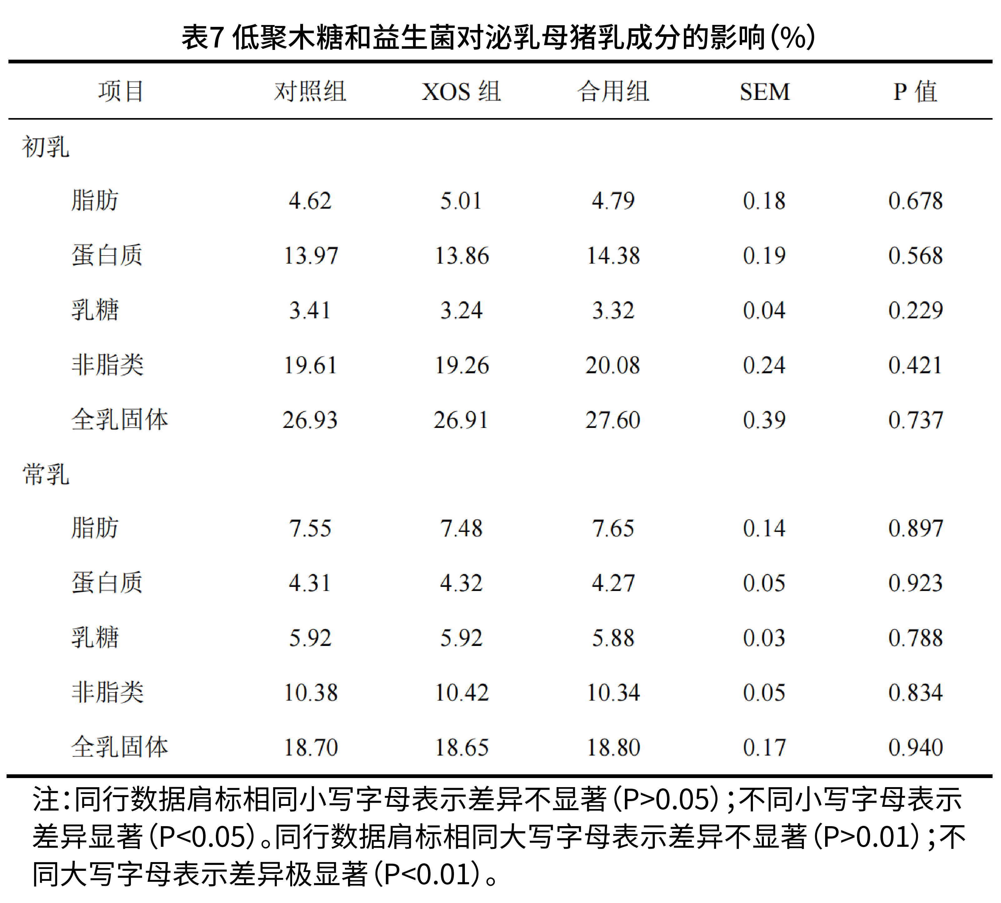 (5)低聚木糖和益生菌对母猪乳成分的影响 从表7可见,XOS组和合用组初乳和常乳中脂肪、蛋白质、乳糖、非脂类和全乳固体与对照组相比差异不显著(P>0.05),但XOS组和合用组初乳中脂肪分别比对照组高8.44 %和3.68 %(P>0.05),合用组初乳中蛋白质比对照组高2.93 %(P>0.05)。