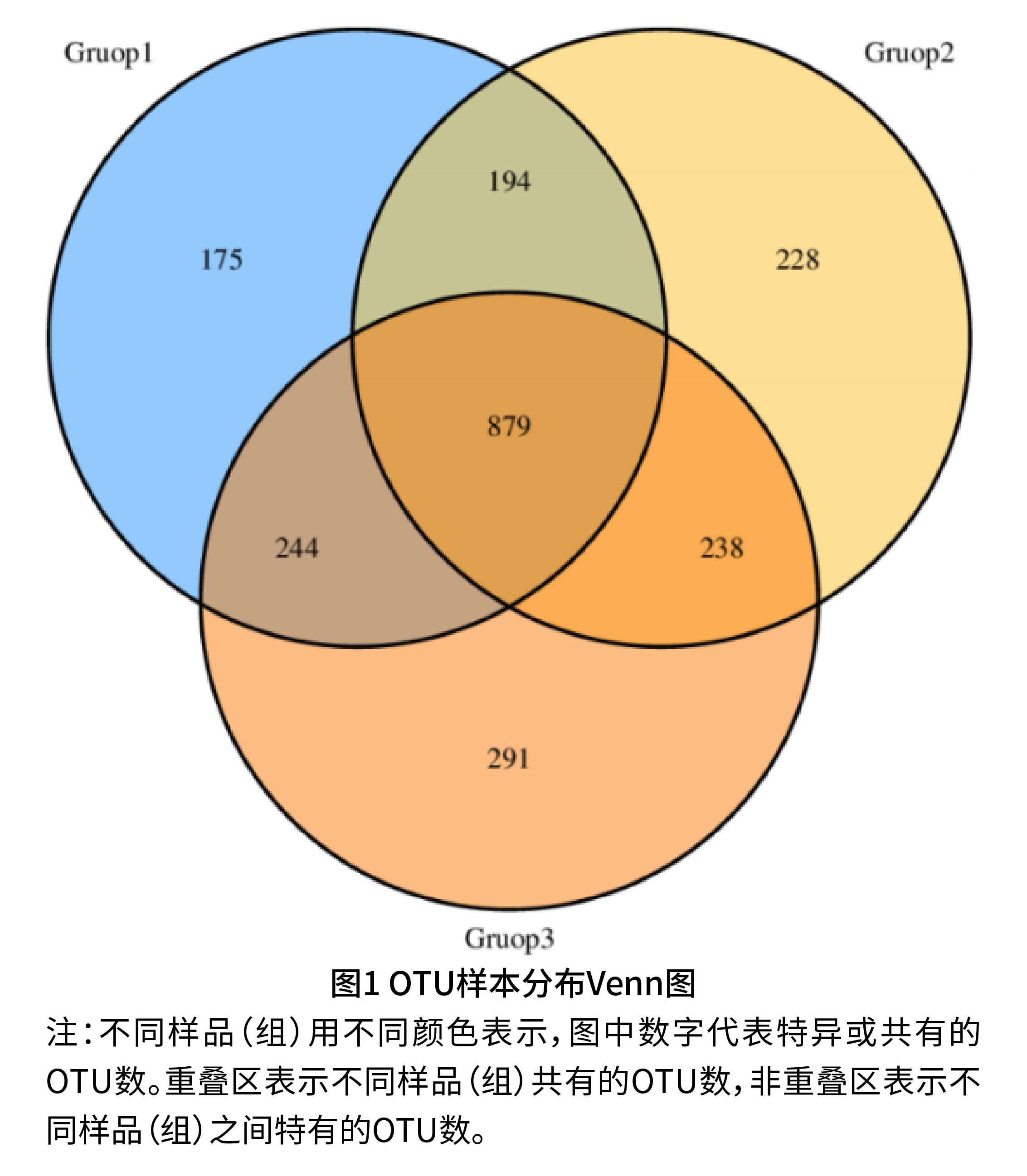 (7)基于宏基因组学16S rDNA测序研究低聚木糖和益生菌对母猪粪便微生物菌群结构的影响 物种注释结果:试验对每个样品的reads数进行统计,所有样品总共得了288,761个有效序列(Sequence),经97%相似性归并后得到 8012个OTUs(Operational Taxonomic Units),测序覆盖深度(coverage指数)0.99。测序深度均在0.99以上,说明样品中序列未被测到的概率较低。 OTU venn diagra分析:如图1所示,数据统计了每组样品中OTU的数目,用组间共有OTU数据和每组特有的OTU数目绘制了Venn图。试验其获得2249个不同OTU,其中3组样品共有的OTU数是879个;对照组(Group1)中共有1492个OTU,175个特有OTU;XOS组(Group2)中共有1539个OTU,228个特有OTU;合用组(Group3)中共有1652个OTU,291个特有OTU。