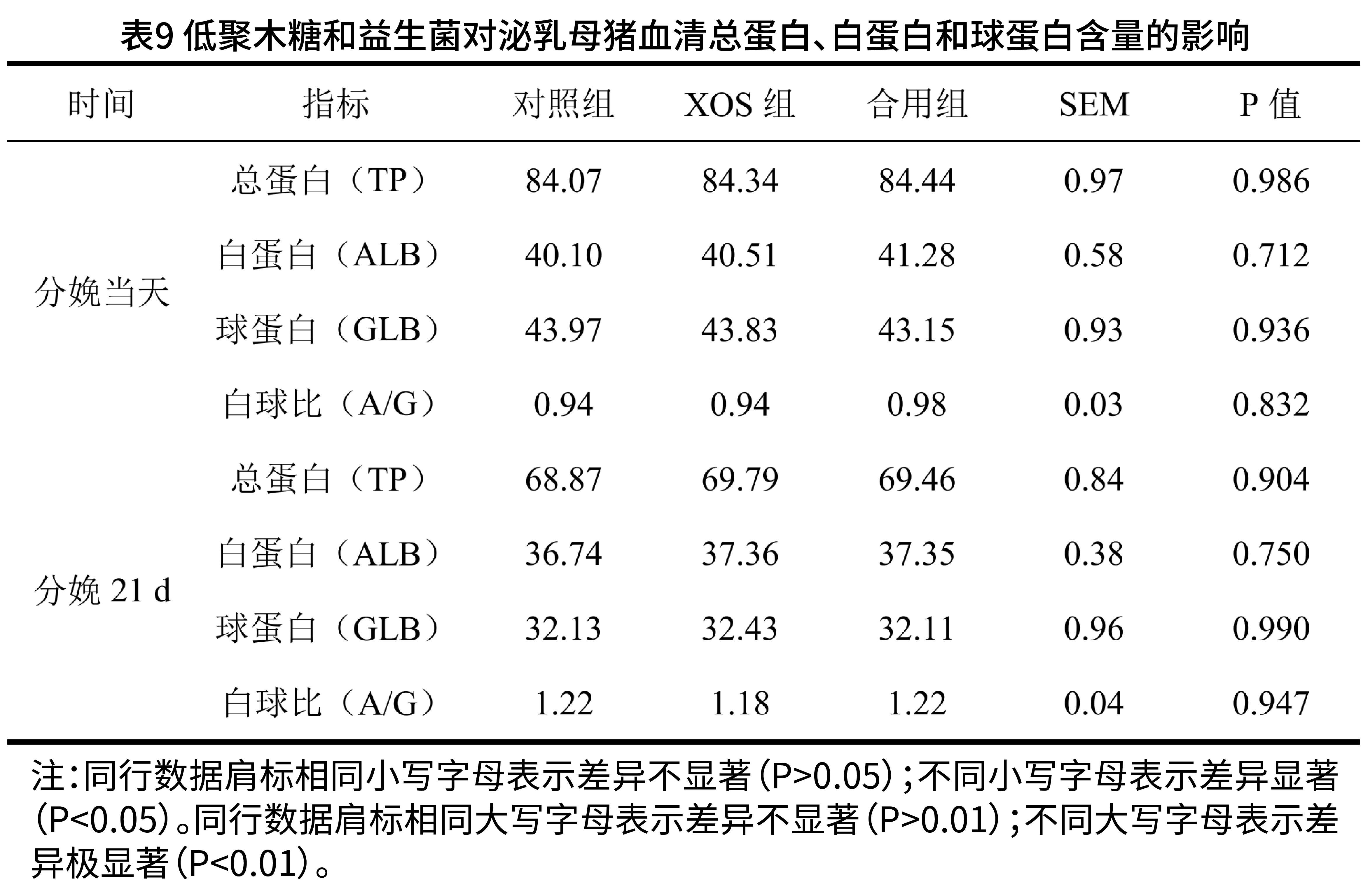 血清生化指标:由表9可知,从总蛋白、白蛋白、球蛋白含量以及白球比来看,分娩当天和21 d时,3个处理组差异不显著(P>0.05)。
