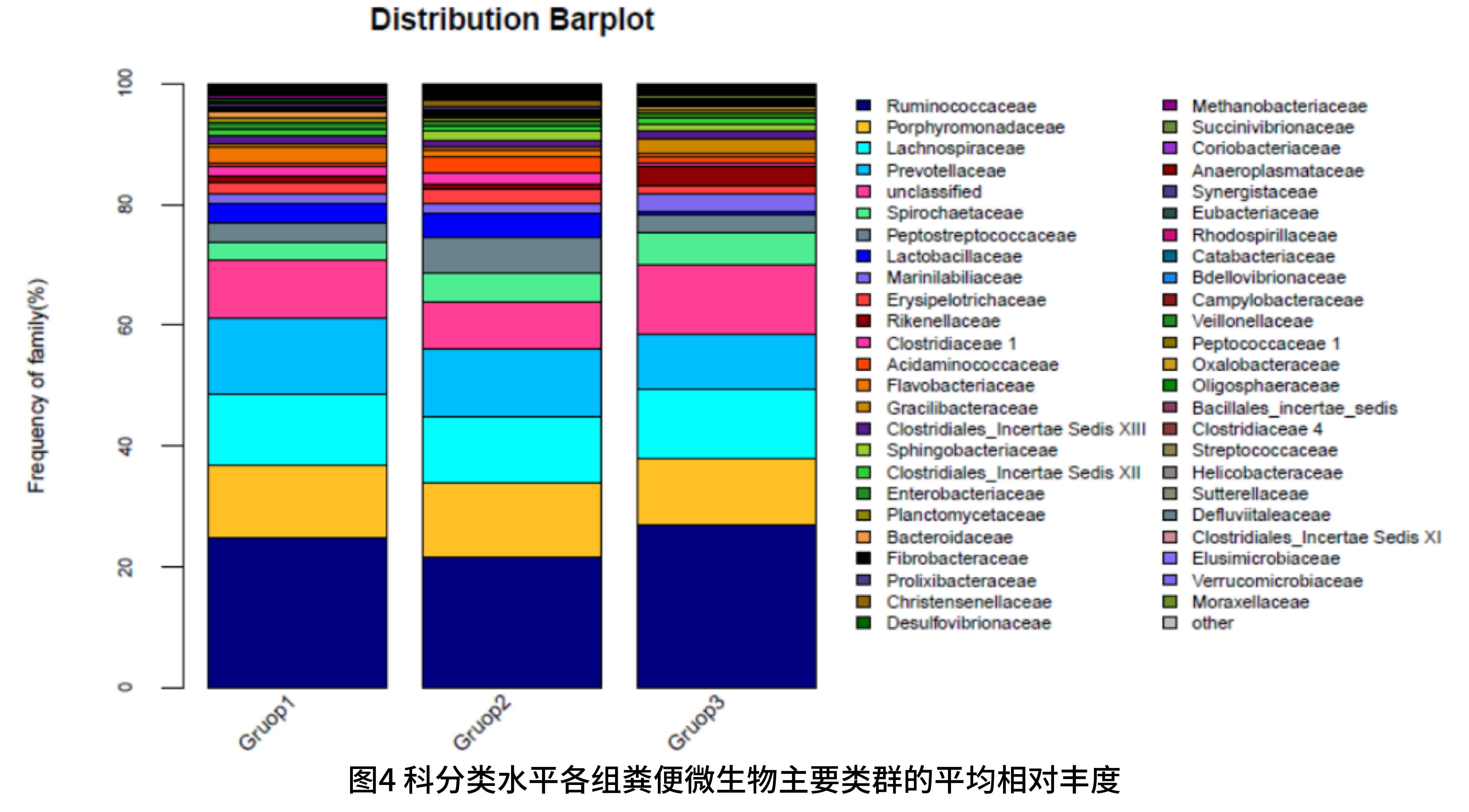 粪便微生物群落结构分析-母猪粪便微生物细菌在科水平上的分布: 各样品按组分析后,粪便微生物主要类群科水平上的平均相对丰度见图4。 结果显示母猪粪便中的优势菌:属水平上除去未知菌群外,共测到48种不同属的微生物:主要包括瘤胃菌(Ruminococcaceae)、紫单胞菌(Porphyromonadaceae)、梭状乳杆菌(Lactobacillaceae) 和普雷沃氏科(Prevotellaceae)等。3组母猪粪便样品中细菌分类存在差异。与对照组(Group1)相比,XOS组(Group2)和合用组(Group3)普雷沃氏科(Prevotellaceae)逐渐减少,螺旋体科(Spirochaetaceae)逐渐增加,梭状芽孢杆菌科(Clostridium)略有增加;瘤胃球菌科(Ruminococcaceae)在添加低聚木糖时有减少,而合用益生菌+低聚木糖时则相对增加。