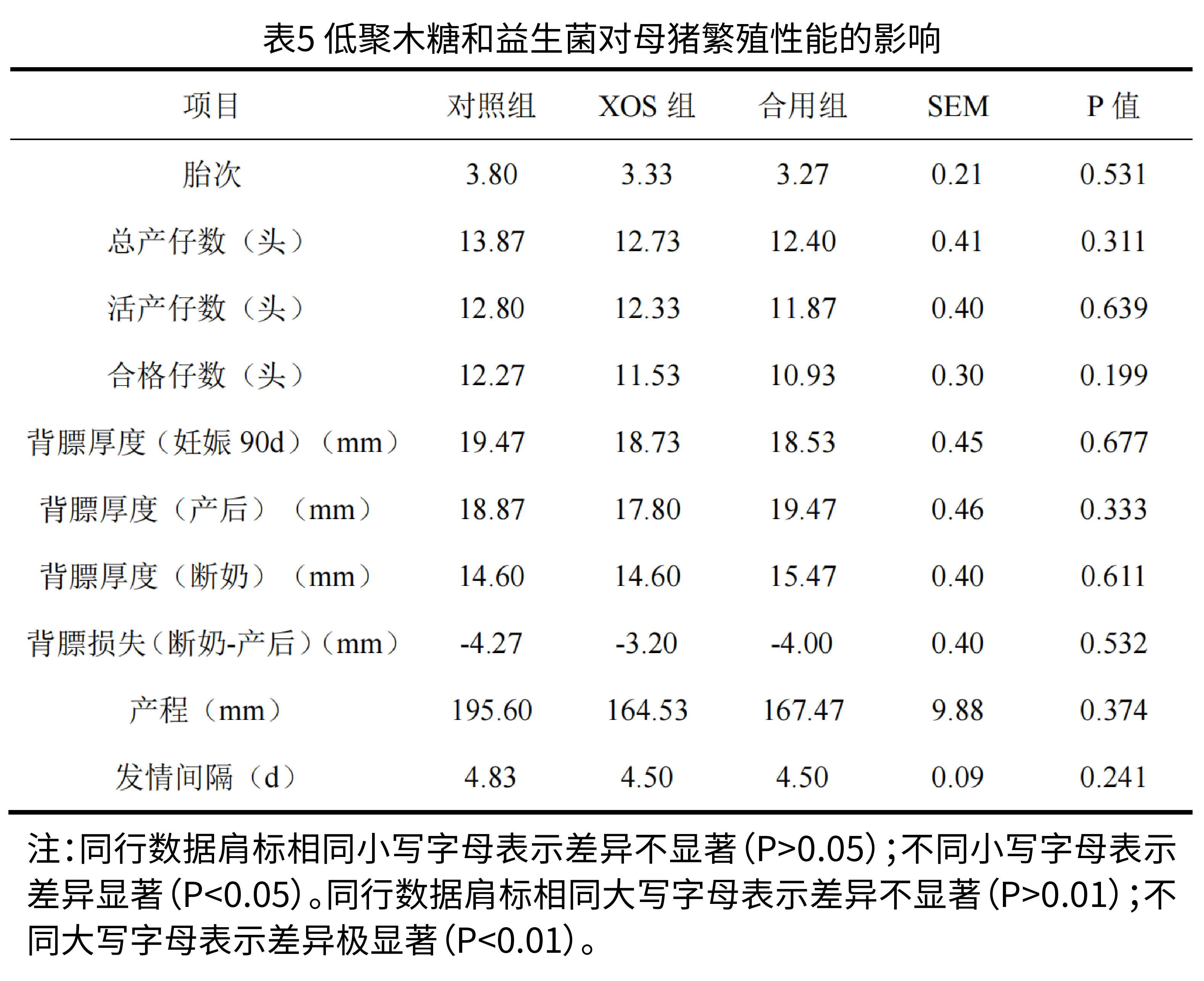 (3)母猪繁殖性能 由表5可见,从总产仔数、活产仔数、合格仔数及母猪产后背膘损失、产程和发情间隔等几方面来看,3个处理组间差异不显著(P>0.05)。从母猪产程来看,XOS组和合用组分别比对照组缩短31.07 min和28.13 min(P>0.05)。从发情间隔来看,XOS组和合用组都比对照组缩短0.33 d(P>0.05)。