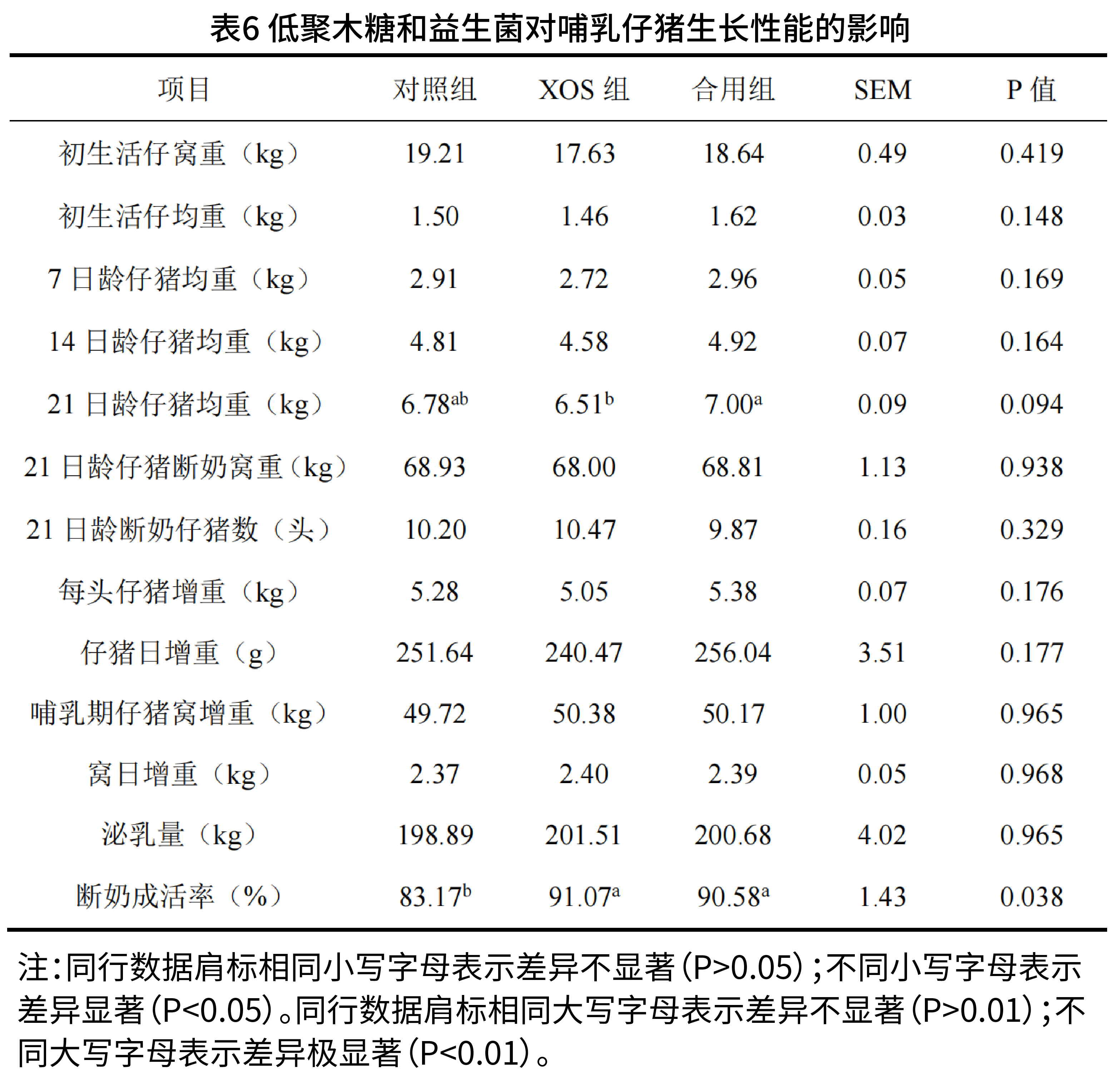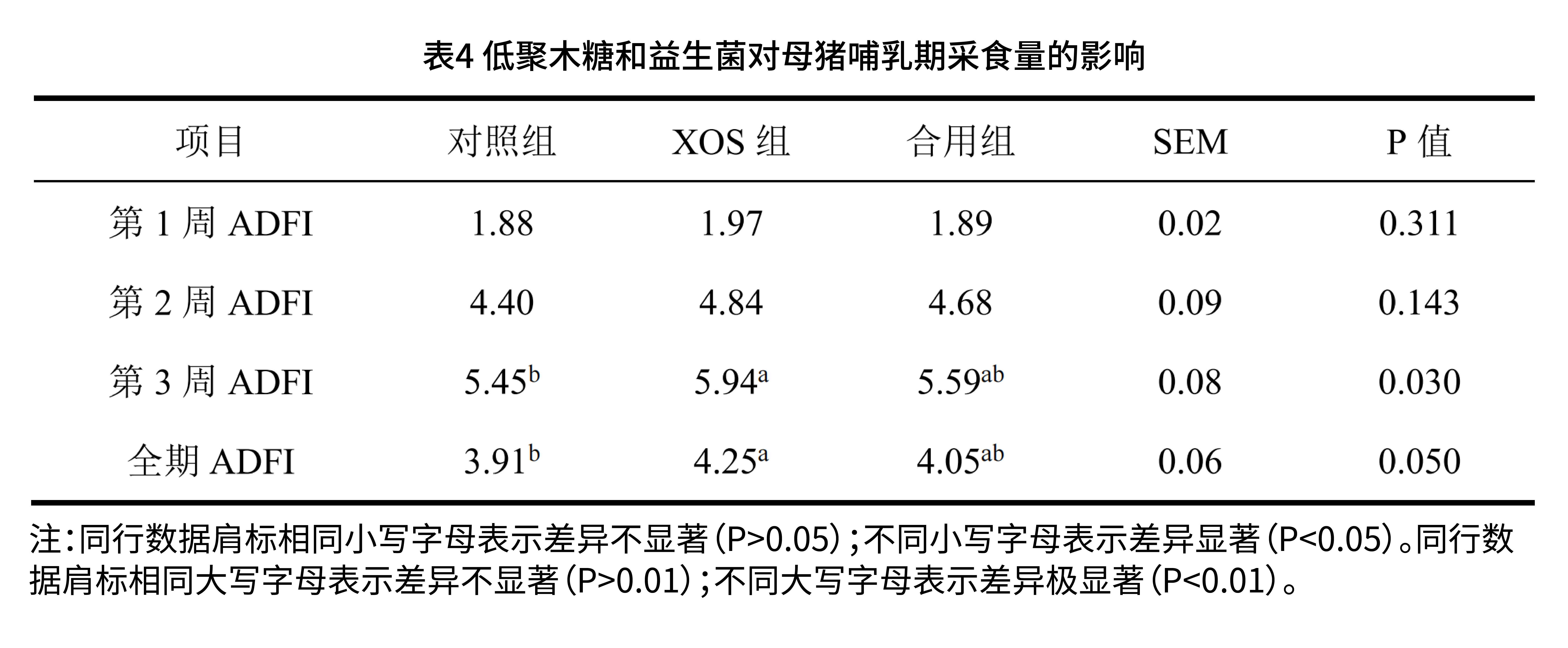 (2)母猪哺乳期采食量 由表4可见,从全期ADFI来看,XOS组和合用组分别比对照组高8.70 % 和3.58 %(P=0.050)。从产后第3周ADFI来看,XOS组和合用组比对照组分别高8.99 %和2.57 %(P=0.030)。从母猪产后第1周和第2周的ADFI来看,3个处理组间差异均不显著(P>0.05)。
