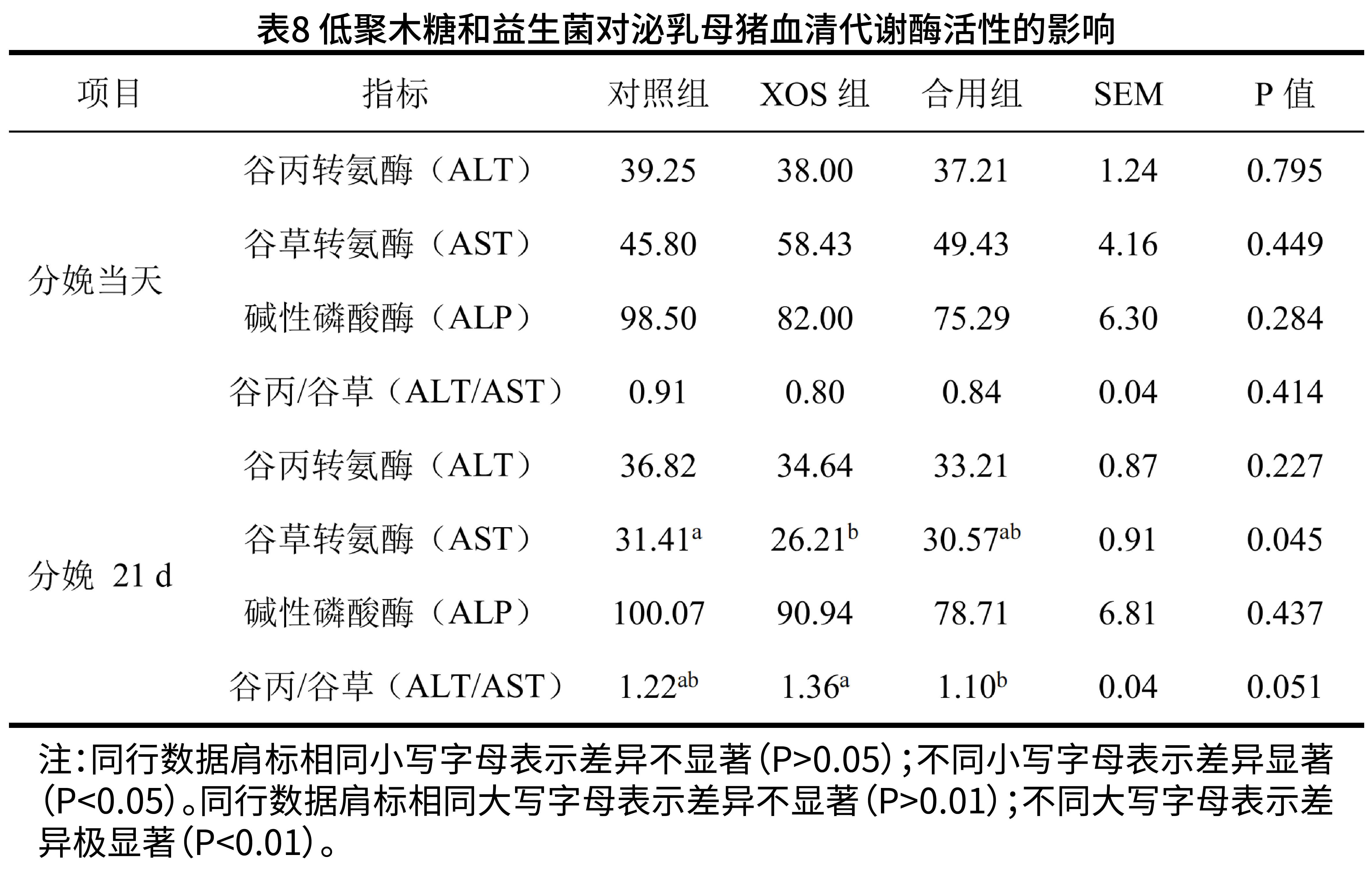 (6)低聚木糖和益生菌对母猪血液生理生化指标的影响 母猪血清代谢酶活性:从表8可见,从谷丙转氨酶(ALT)活性来看,分娩当天和分娩21 d,3个处理组间差异不显著(P>0.05)。从谷草转氨酶(AST)活性来看,分娩当天,3个处理组间差异不显著(P>0.05),但XOS组和合用组分别比对照组高27.58 %和7.92 %;分娩后21d,XOS组比对照组低16.56 %(P=0.045),合用组比对照组低2.67 %(P=0.045)。从碱性磷酸酶活性来看,分娩当天XOS组和合用组分别比对照组低16.75 %和23.56 %(P=0.284);分娩21d时XOS组和合用组比对照组低9.12 %和21.34 %(P>0.05)。从谷丙/谷草比值来看,3个处理组在分娩当天差异均不显著(P>0.05)。