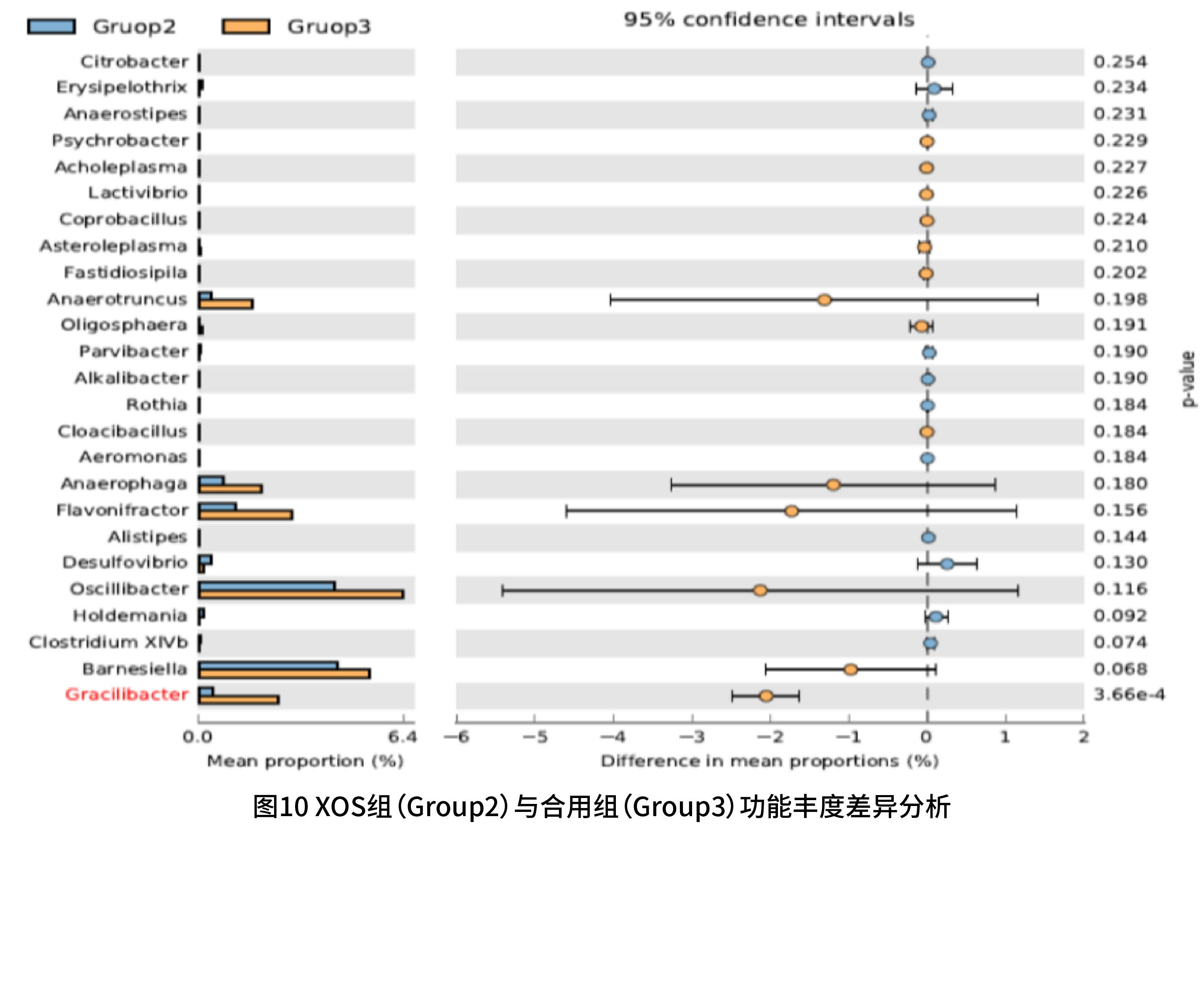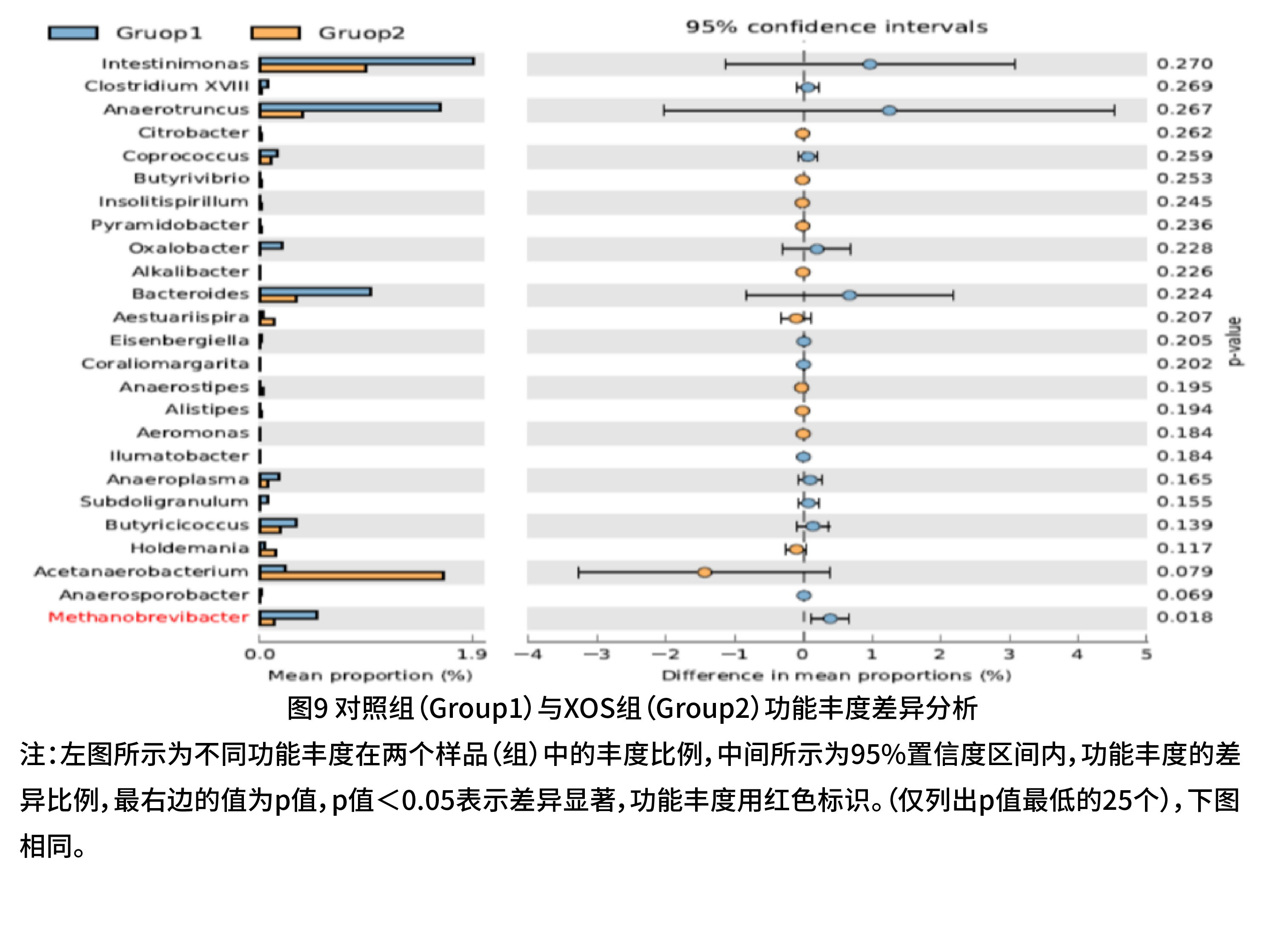 组间菌群结构比较:不同组间的功能丰度差异见图9、10、11。由图9、10、11可见,对照组(Group1)的短杆菌(Methanobrevibacter)显著高于XOS组(Group2),合用组(Group3)的厚壁菌(Gracilibacter)显著高于XOS组(Group2),合用组(Group3)的厌氧弧菌(Anaerovibrio)显著高于对照组(Group1)。