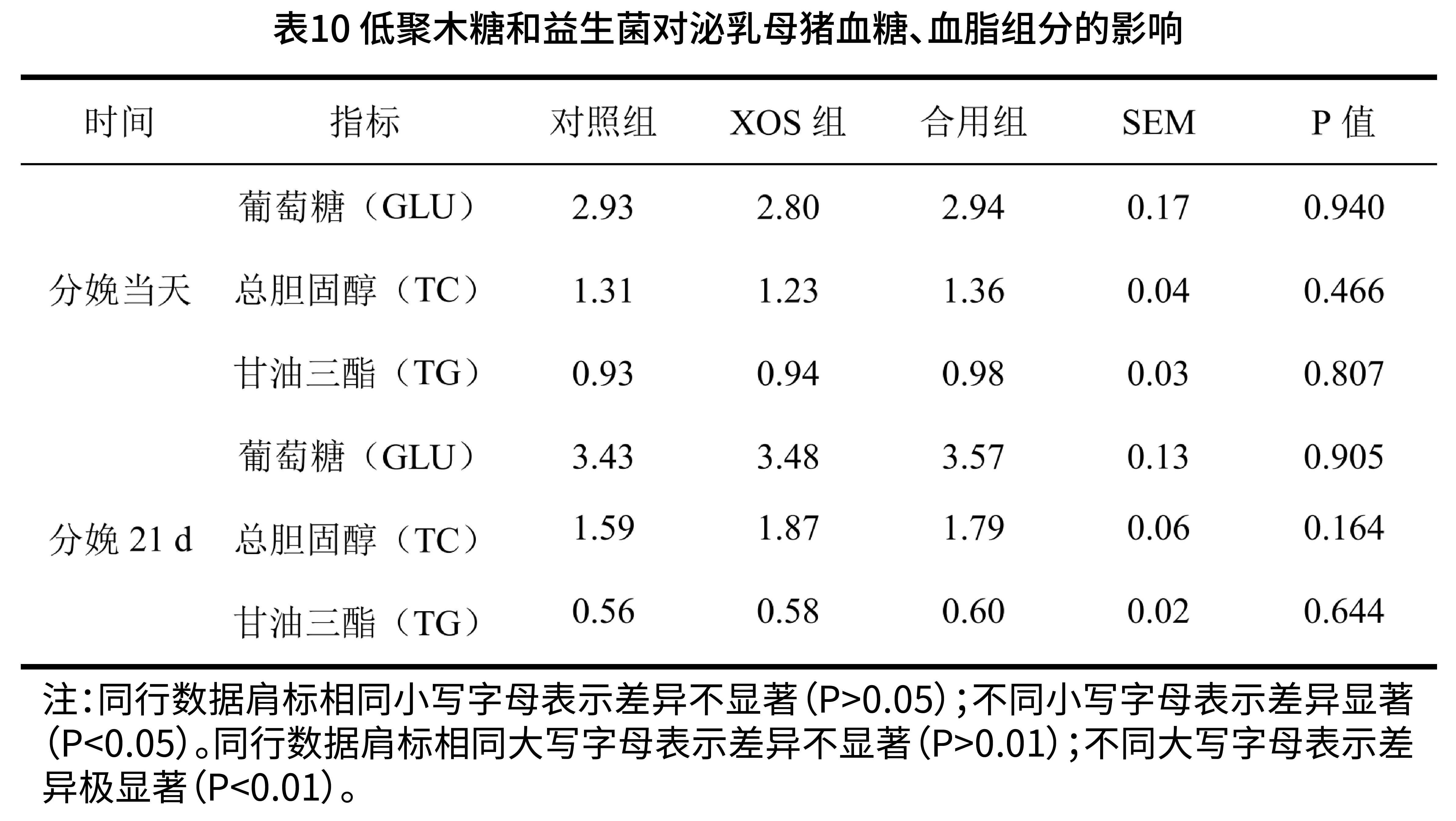 母猪血清血糖、血脂组分:由表10可知,从葡萄糖、总胆固醇和甘油三酯含量来看,分娩当天和21d时,3个处理组间差异均不显著(P>0.05)。