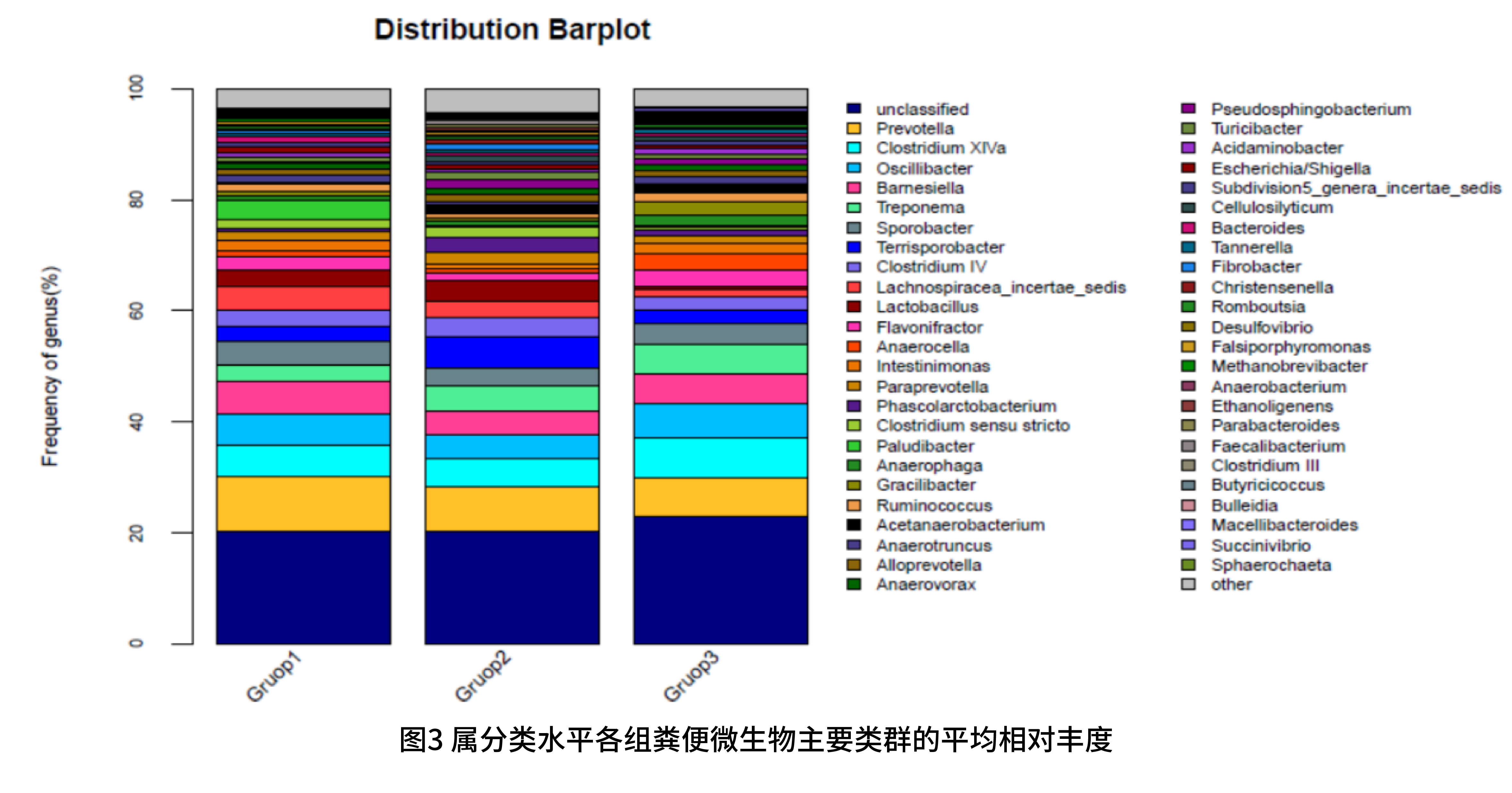 粪便微生物群落结构分析-母猪粪便微生物细菌在属水平上的分布: 各样品按组分析后,母猪粪便微生物主要类群属水平上的平均相对丰度见图3。 结果显示母猪粪便中的优势菌:属水平上除去未知菌群外,共测到48种不同属的微生物,未分类菌属均占20%以上,3类母猪粪便样品中细菌分类存在差异。 与对照组(Group1)相比,XOS组(Group2)和合用组(Group3)普雷沃氏菌属(Prevotella)逐渐减少,梭状芽孢杆菌XIVa属(Clostridium XIVa)略有增加;乳酸杆菌属(Lactobacillus)在添加低聚木糖时有增加,低聚木糖+益生菌合用时反而相对减少。