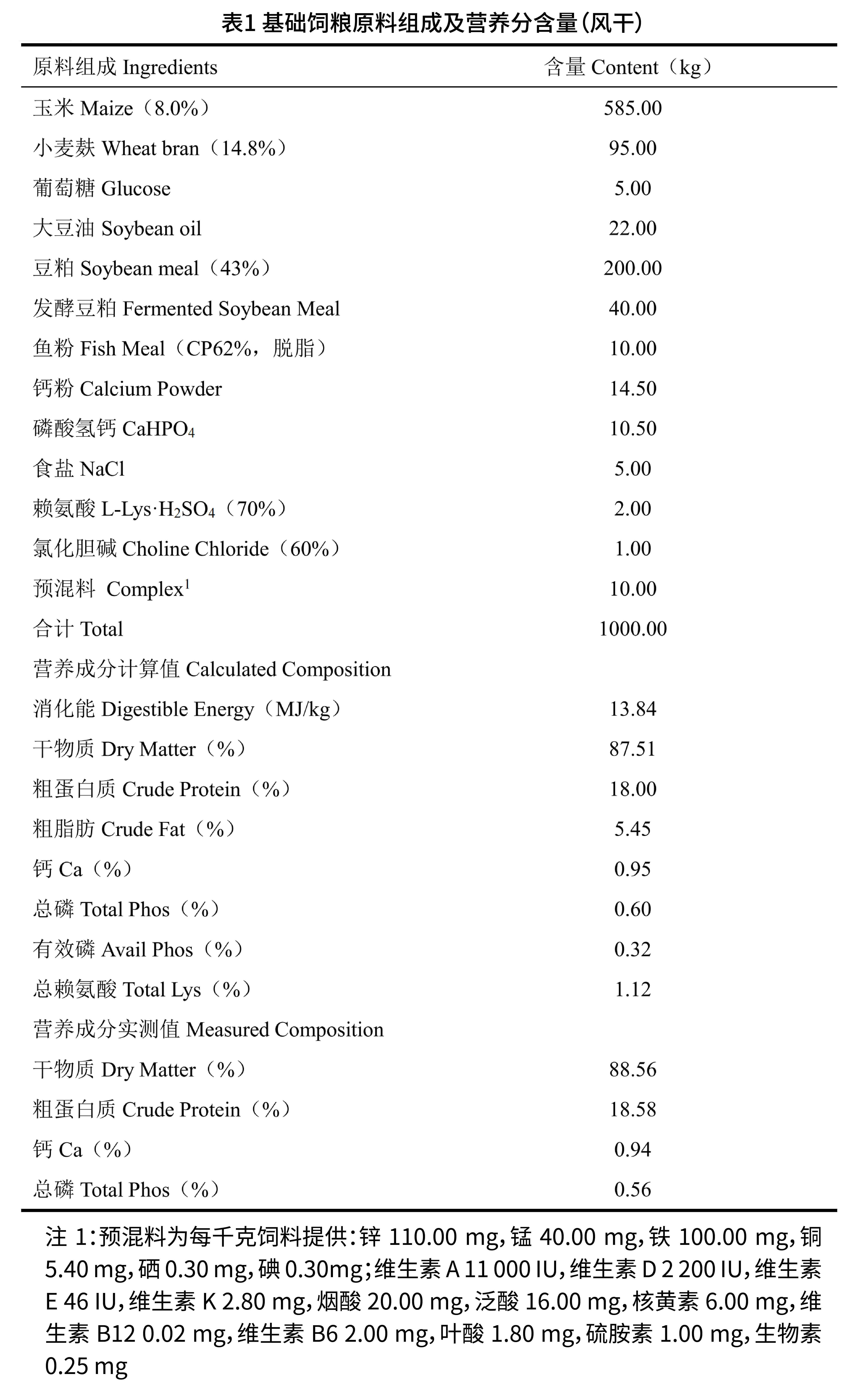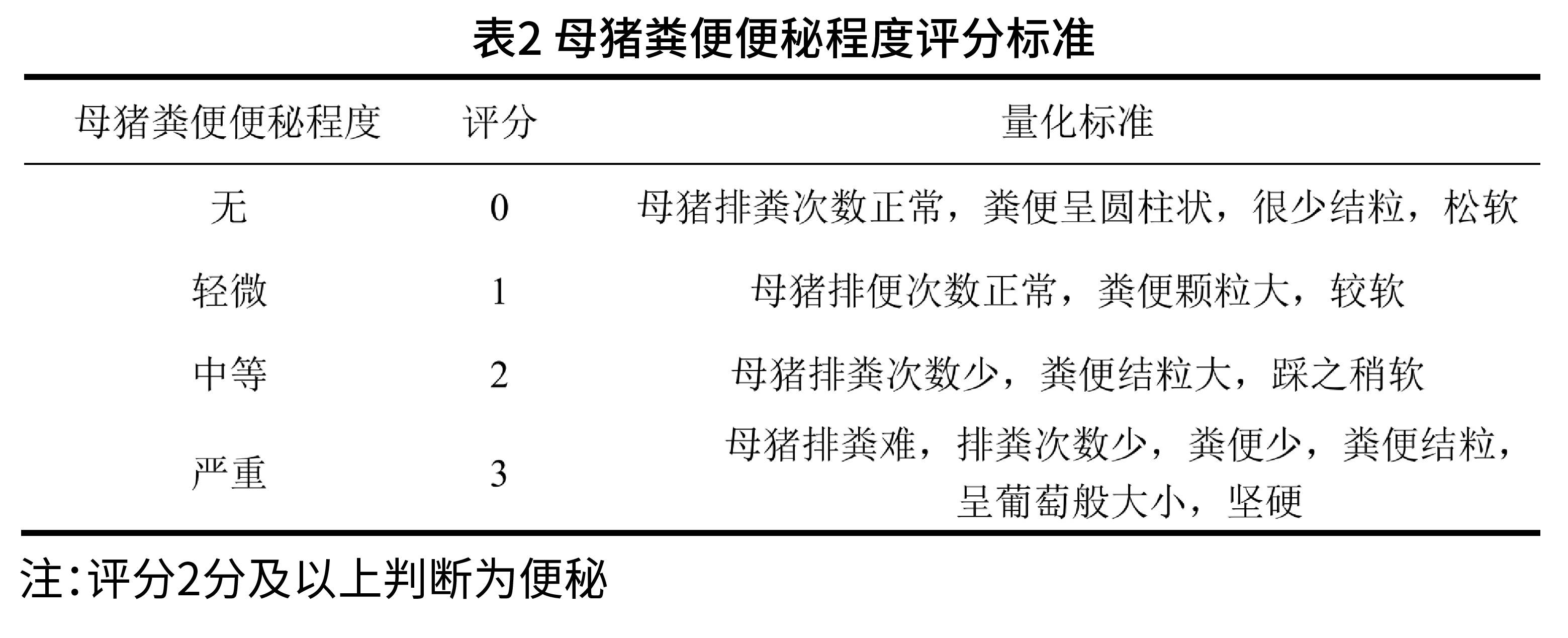 试验目的 主要探讨妊娠后期母猪饲粮中合用低聚木糖和益生菌对母猪繁殖性能、粪便微生物及哺乳仔猪生长性能的影响。 试验设计 本实验采用随机区组实验设计,选取妊娠90 d,体重、胎次(3-4胎)及预产期相近的纯种母猪(长白或大白)60头,随机分为3个处理,每个处理20个重复,每个重复1头母猪。对照组(处理1)饲喂基础饲粮,试验组分别添加175 mg/kg XOS(XOS组)、175 mg/kg XOS +300 mg/kg 益生菌(合用组),试验期52 d。 低聚木糖净含量≥35%,枯草芽孢杆菌含菌量≥3.0×1010 CFU/g。试验基础饲粮成分见表1。 泌乳量=(断奶窝重-初生窝重)×4。 母猪粪便便秘程度评分标准见表2。