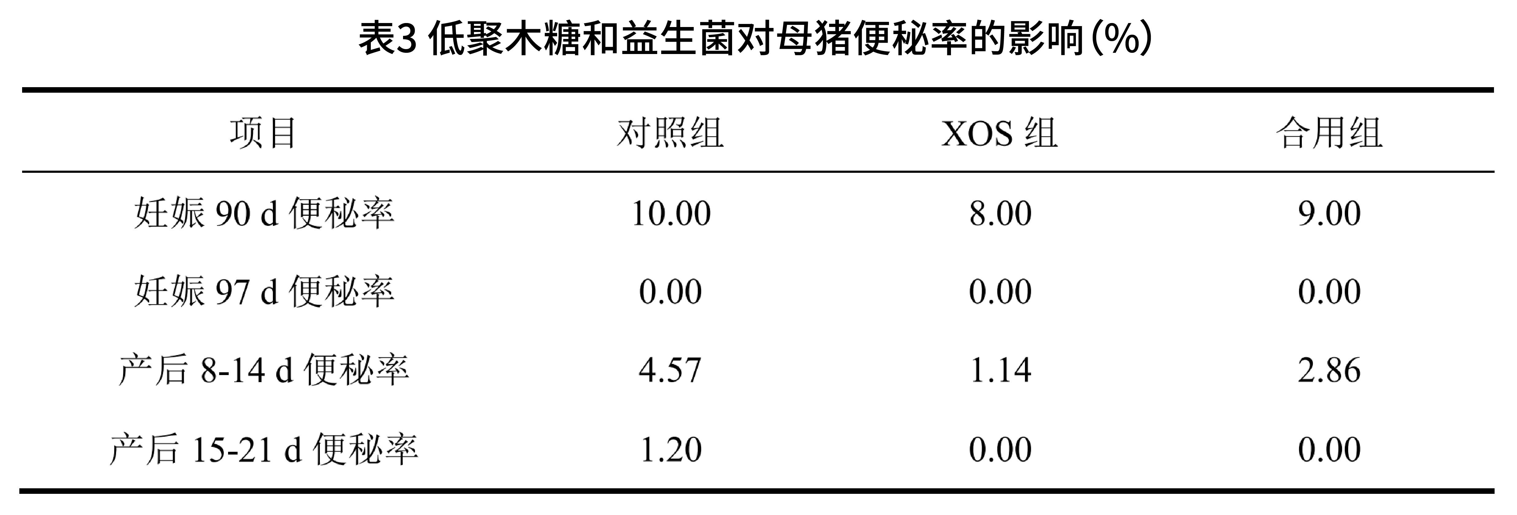 试验结果 (1)母猪便秘率 由表3可见,试验初期(妊娠90 d)3个处理组便秘率都低于10.00 %,妊娠97 d、产后8-14 d和产后15-21 d时3个处理组的便秘率都低于5.00 %。