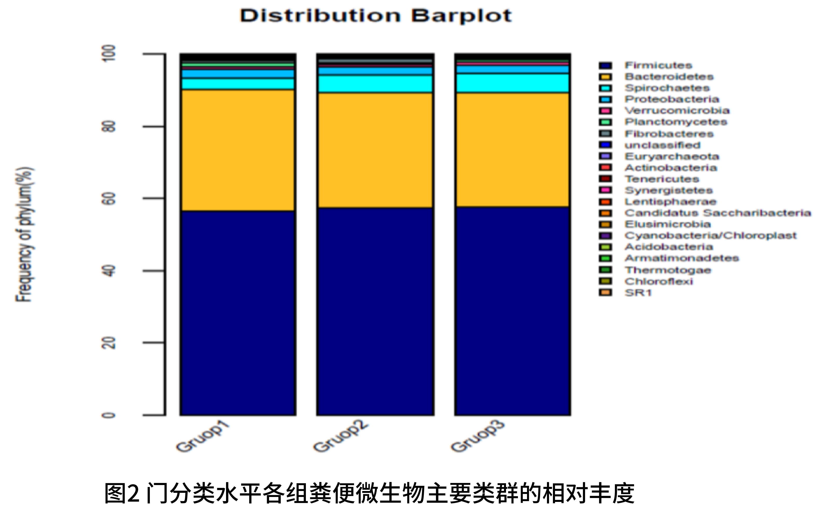 粪便微生物群落结构分析-母猪粪便微生物细菌在门水平上的分布: 各样品按组分析后,母猪粪便微生物主要类群门水平上的平均相对丰度见图2。结果显示母猪粪便中的优势菌:门水平上除去未知菌群外,共测到20种不同门的微生物,主要包括厚壁菌门(Firmicutes)和拟杆菌门(Bacteroidetes)(占绝对优势,达90%以上),与人类和动物肠道微生物组研究结果一致。与对照组(Group1)相比,XOS组(Group2)和合用组(Group3)螺旋体门(Spirochaetes,部分为致病菌)有较大增加;变形细菌门Proteobacteria(多为格兰氏阴性菌,如大肠杆菌、沙门氏菌等)略有减少,表明益生菌和低聚木糖对变形细菌门有一定抑制作用。
