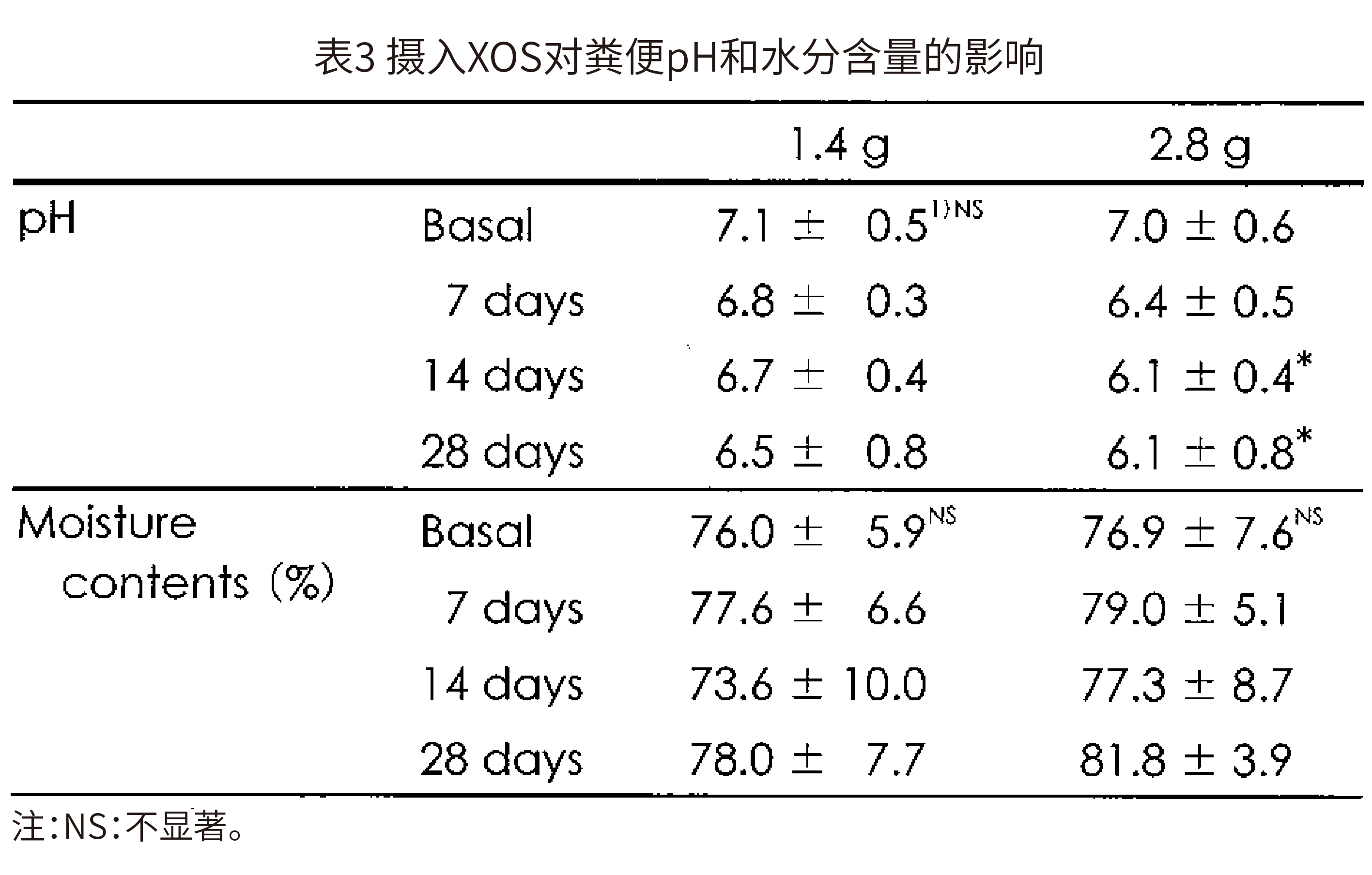 (2)粪便pH和水分含量 如表3所示,摄入XOS后,1.4 g组的pH值在第7、14和28 d分别为6.8、6.7和6.5,而2.8 g组的pH值在第7、14和28 d分别为6.4、6.1和6.1,且2.8 g组从第14 d开始显著下降;1.4 g和2.8 g组摄入XOS后的水分含量均有所增加,但差异无统计学意义。