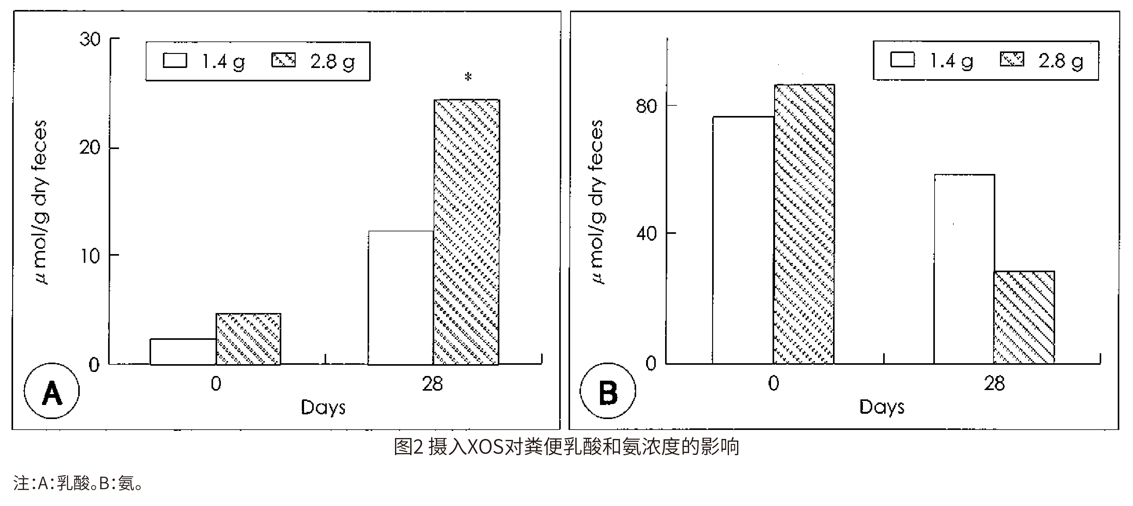 (4)粪便中的乳酸浓度和氨浓度 如图2所示,摄入XOS后,2.8 g组粪便中乳酸浓度显著增加;1.4 g和2.8 g组摄入XOS后的氨浓度均比摄入前小,但无显著差异。