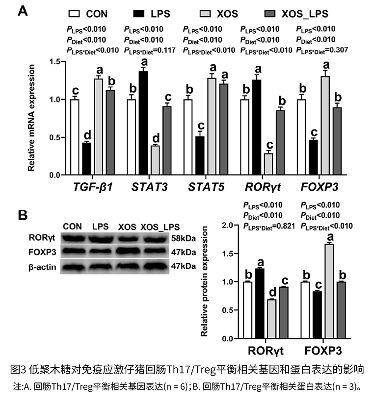 (3)低聚木糖对免疫应激仔猪回肠及胸腺Th1 7/Treg平衡相关基因和蛋白的影响 低聚木糖对免疫应激仔猪回肠和胸腺Th17/Treg平衡相关基因和蛋白的影响见图3和图4。与CON组相比,XOS组显著提高了回肠和胸腺中TGF-β1、FOXP3和STAT5的mRNA表达及FOXP3的蛋白表达(P < 0.05);显著降低了RORγt和STAT3的mRNA表达水平及RORγt的蛋白表达水平(P < 0.05)。与CON组相比,LPS组显著降低了回肠和胸腺中TGF-β1、FOXP3和STAT5的mRNA表达水平及FOXP3的蛋白表达水平(P < 0.05);显著提高了RORγt和STAT3的mRNA表达水平及RORγt的蛋白表达水平(P < 0.05)。 在LPS处理下,日粮添加低聚木糖抑制了LPS造成的影响,表现为回肠和胸腺中TGF-β1、FOXP3和STAT5的mRNA表达水平及FOXP3的蛋白表达水平升高(P < 0.05);RORγt和STAT3的mRNA表达水平及RORγt的蛋白表达水平降低(P < 0.05)。低聚木糖和LPS对回肠TGF-β1、STAT5和RORγt的基因表达、回肠和胸腺FOXP3的蛋白表达和胸腺STAT5的基因表达的影响存在交互作用(P < 0.05)。