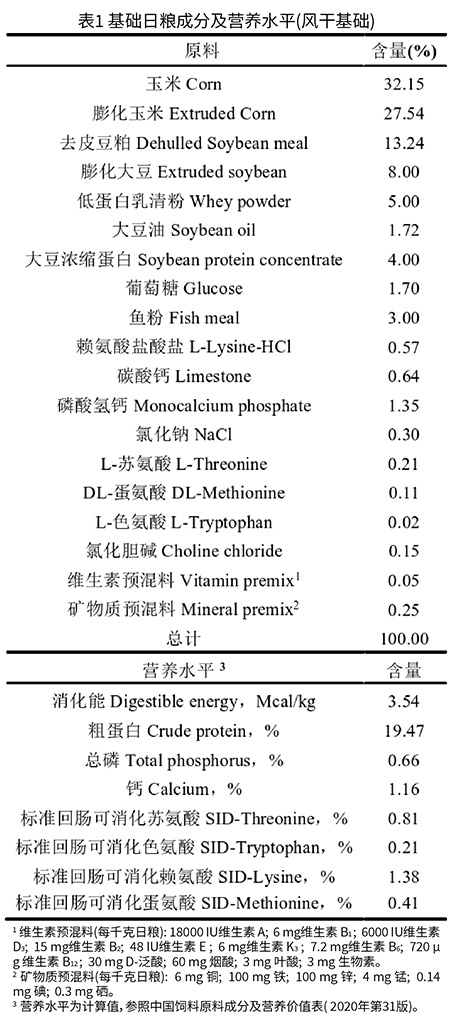 试验目的 本试验旨在探究低聚木糖对免疫应激仔猪肠道和胸腺免疫的影响。 试验设计 本研究采用2×2双因素试验设计,将24头断奶仔猪(7.84±0.27 kg,杜洛克×长白×约克夏)随机分配进基础日粮组或低聚木糖日粮组(基础日粮+0.02%低聚木糖)中饲喂21 d。在第22 d上午,对基础日粮组和低聚木糖日粮组的仔猪腹腔注射100 μg/kg体重LPS溶液(大肠杆菌血清型055:B5,L2880):各组中一半的仔猪注射LPS溶液,分别为LPS组和XOS_LPS组;另一半仔猪则注射相同体积的生理盐水,分别为CON组和XOS组。注射LPS或生理盐水后,仔猪被禁食4 h,随后屠宰并收集相应的样品进行后续研究。 低聚木糖纯度≥35%。本试验日粮为玉米-豆粕型,其配方遵循了NRC(2012)对7-25 kg的仔猪营养需求的建议。基础日粮的具体成分和营养水平见表1。