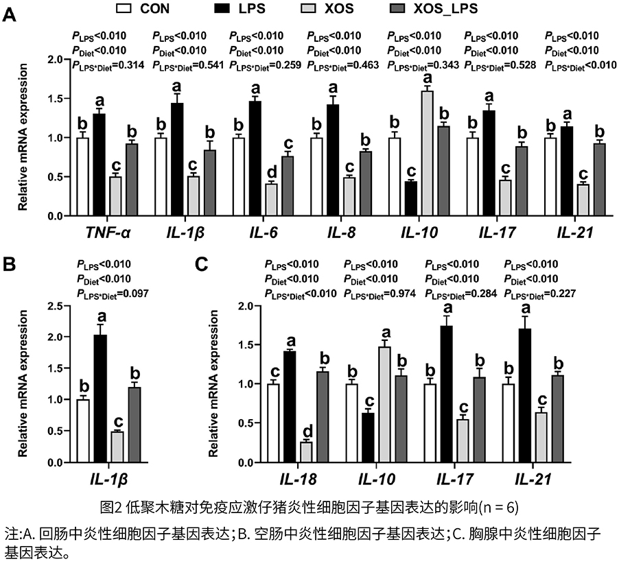 (2)低聚木糖对免疫应激仔猪促炎细胞因子mRNA表达的影响 如图2所示,同CON组相比,LPS组中回肠促炎细胞因子(TNF-α、IL-21、IL-1 7、IL-8、IL-6和IL-1β)、空肠促炎细胞因子(IL-1β)和胸腺促炎细胞因子(IL-18、IL-1 7和IL-21)的mRNA表达显著升高(P < 0.05);回肠和胸腺中IL-10的mRNA表达降低(P < 0.05)。与CON组相比,XOS组中回肠促炎细胞因子(TNF-α、IL-21、IL-1 7、IL-8、IL-6和IL-1β)、空肠促炎细胞因子(IL-1β)和胸腺促炎细胞因子(IL-18、IL-1 7和IL-21)的mRNA表达显著降低(P < 0.05);回肠和胸腺中IL-10的mRNA表达显著升高(P < 0.05)。 在LPS处理下,日粮添加低聚木糖的仔猪回肠促炎细胞因子(TNF-α、IL-21、IL-1 7、IL-8、IL-6和IL-1β)、空肠促炎细胞因子(IL-1β)和胸腺促炎细胞因子(IL-18、IL-1 7和IL-21)的mRNA表达显著降低(P < 0.05);回肠和胸腺中IL-10的mRNA表达显著增加(P < 0.05)。低聚木糖和LPS对回肠IL-21与胸腺IL-18的基因表达的影响存在交互作用(P < 0.05)。