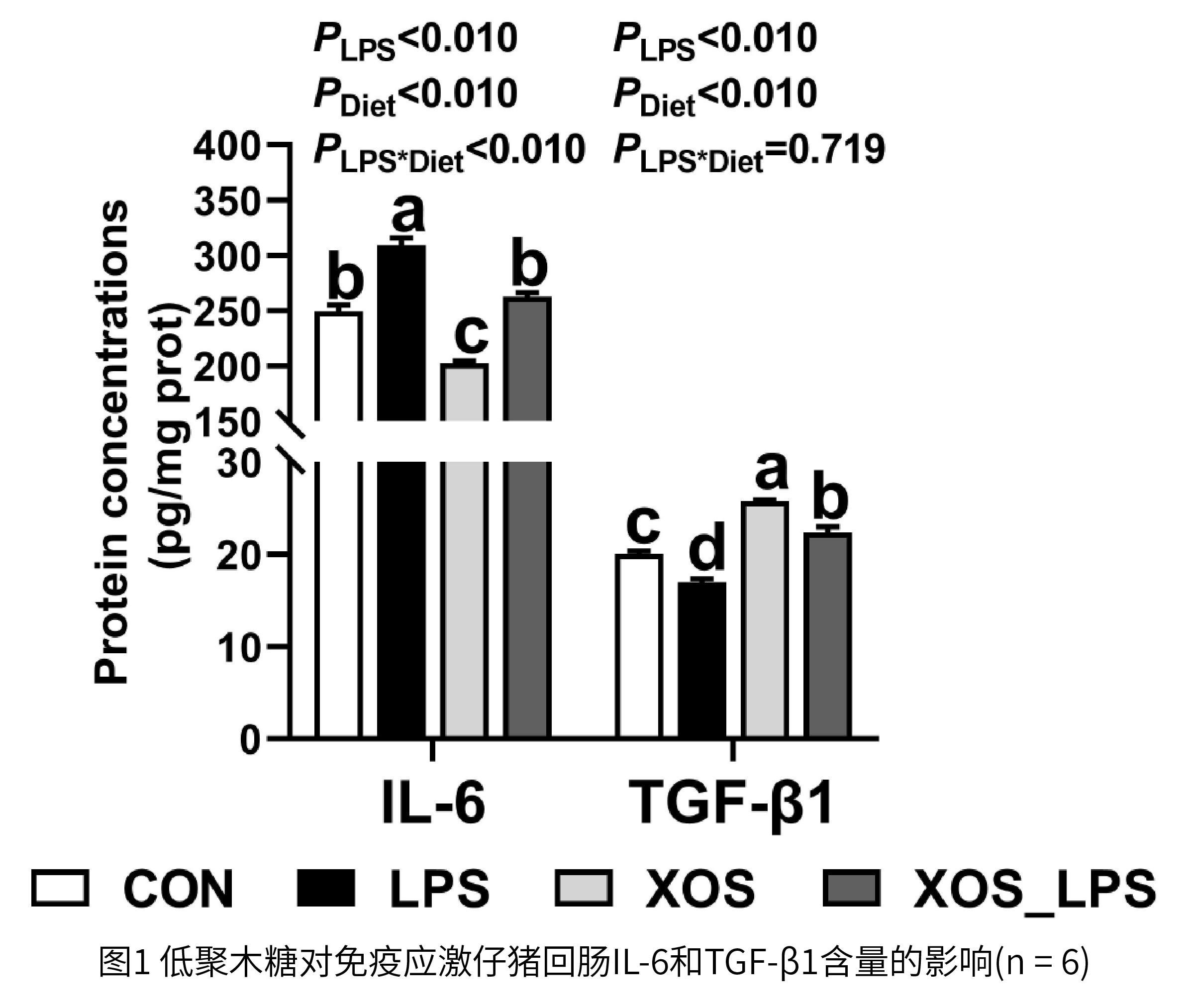 试验结果 (1)低聚木糖对免疫应激仔猪回肠细胞因子含量的影响 低聚木糖对免疫应激仔猪回肠炎性细胞因子含量的影响见图1。同CON组相比,LPS组具有更高的回肠IL-6含量和更低的TGF-β1含量(P < 0.05);XOS组的IL-6含量降低,TGF-β1含量升高(P < 0.05)。 在LPS处理下,日粮添加低聚木糖降低了回肠中IL-6的含量,增加了TGF-β1的含量(P < 0.05)。低聚木糖和LPS对IL-6含量的影响具有交互作用(P < 0.05)。