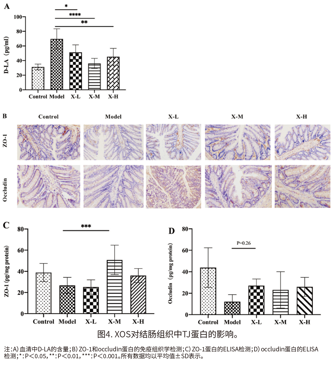 (3)XOS对肠道屏障的影响 如图4A所示,模型小鼠血清中的D-LA显著高于对照小鼠,增加了1.23倍。血清中D-LA的浓度随着XOS的干预处理而下降,特别是0.50 mg g-1 BW day-1的XOS干预处理使D-LA的浓度下降48.3%。