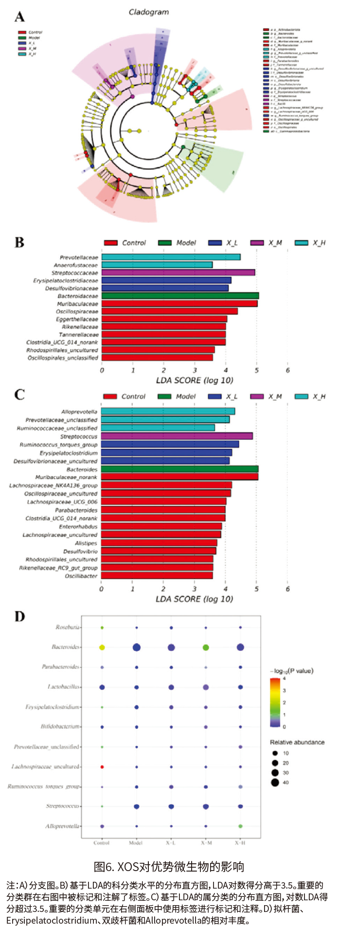 如图6A-6C所示,在科水平上,在番泻叶提取物和0.25、0.50和1.00 mg g-1 BW day-1 XOS组中分别发现1、2、1和2个分类群。在属的分类水平上,在四个组中分别发现了1、3、1和3个分类群的优势群落。其中,在模型组中,拟杆菌科(Bacteroidaceae)和拟杆菌(Bacteroides)占优势。在X-L组中,Erysipelatoclostridiaceae、Desulfovibrionaceae和Ruminococcus_torques占优势。而Prevotellaceae、Anaerofustaceae、Alloprevotella和Ruminococcaceae是X-H组的主要微生物。图6D显示,与模型组相比,XOS干预小鼠显示出双歧杆菌和乳酸杆菌的丰度增加,拟杆菌的丰度显著下降。