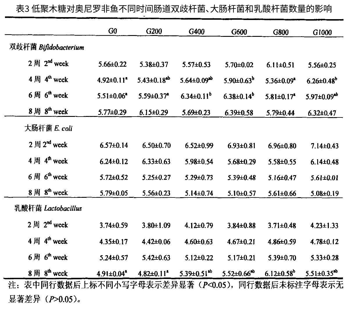 (2)饲料中添加低聚木糖对奥尼罗非鱼肠道菌群的影响 由表3可知,奥尼罗非鱼中肠双歧杆菌数量,在第4周时,G600组和G1000组双歧杆菌数量显著高于对照组(P<0.05),在第6周时,G400组和G600组双歧杆菌数量显著高于对照组(P<0.05)。各试验组双歧杆菌数量随着饲养时间的延长呈增加趋势。 随着饲养时间的延长,各试验组大肠杆菌数量均有下降的趋势;在第8周时,G800组乳酸杆菌数量显著高于对照组(P<0.05),各试验组乳酸杆菌数量随饲养时间延长呈增加趋势。