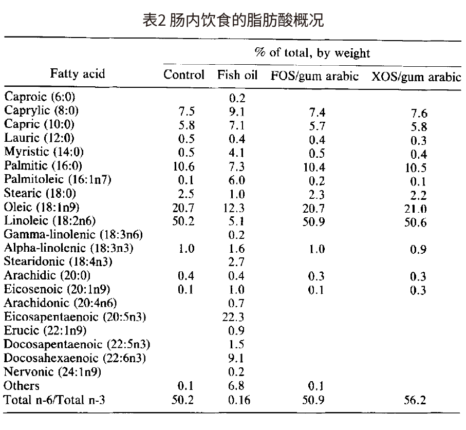 试验设计 采用特异性无病原体的雌性Lewis大鼠(175~200 g)作为试验研究对象,第一组试验,将大鼠随机分为3组,Sham chow组(假手术对照组,n=10)、PG/PS chow组(结肠炎组,n=29)和SAZ组(在诱导结肠炎后立即在其饮水中给予柳氮磺吡啶(SAZ)的组(100 mg/kg/d,n=8),通过注射纯化肽聚糖-多糖(PG/PS)诱导结肠炎;第二组试验,将大鼠随机分为6组,Control(No PG/PS)组(喂食对照饮食的假手术组,n=7)、Chow组(喂食饲料的结肠炎组n=29),以及喂食肠内饮食的四个结肠炎组,如表1和表2所示,Control组(肠内饮食,n=7)、Fish Oil组(补充FO的肠内饮食,n=8)、FOS组(补充FOS的肠内饮食,n=8)和XOS组(补充XOS的肠内饮食,n=8)。所有大鼠在结肠炎诱导前接受1周饲喂,随后再接受3周饲料或肠内配方。实验为期4周,包括诱导前和注射后。日采食量和体重每24小时记录一次。标准大鼠实验室饲料包括22%的蛋白质、5%的脂肪和4.5%的纤维。