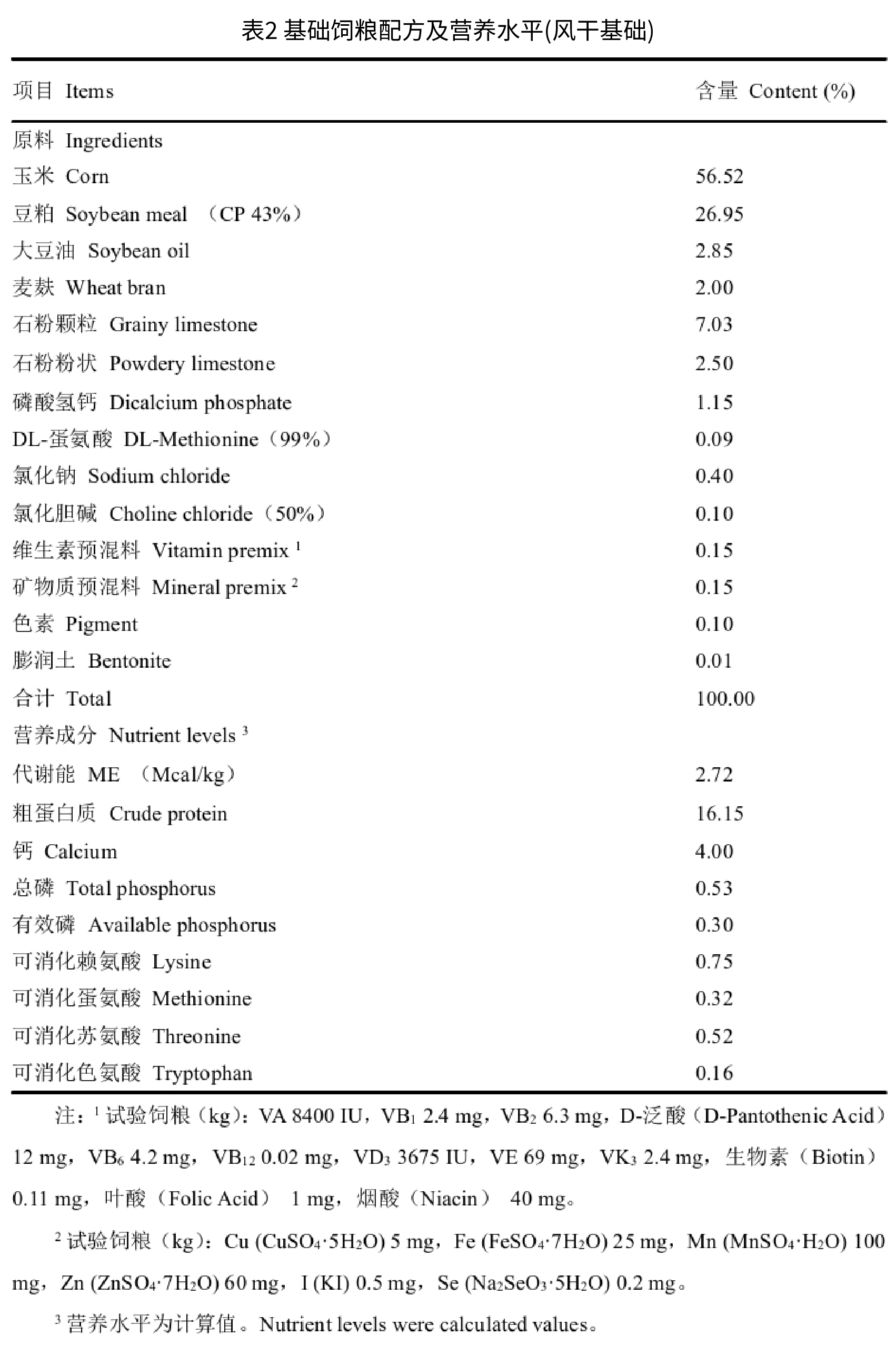 试验目的 本试验旨在研究低聚木糖和乳酸片球菌对蛋鸡产蛋性能和蛋品质的影响。 试验设计 本试验采用3×3二因子试验设计(见表1),XOS设三个添加水平,分别为:0、200、400 mg/kg;乳酸片球菌(PA CNCMI-4622)设三个添加水平,分别为:0、50、100mg/kg。选用1296只48周龄体重相近、机体健康的罗曼粉蛋鸡进行试验,预饲期2周,正式期12周。依据产蛋率无差异原则,随机分为9个处理,每个处理8个重复,每个重复18只鸡。 试验以玉米-豆粕型为基础饲粮,根据NRC(1994)和中国鸡饲养标准(NY/T33-2004)推荐的营养水平以及参考罗曼粉商品蛋鸡饲养管理指南来设计饲料配方,并结合养殖场生产实际来配制饲粮,全期使用粉料。XOS和PA CNCMI-4622均采用逐级预混合的方式来配制。基础饲粮组成及营养水平见表2。 XOS含量为35%。PA CNCMI-4622活菌含量为≥108CFU/g。 饲养日产蛋率(%)=蛋总数(枚)/饲养日鸡只数(只)*100%。 入舍鸡产蛋率(%)=蛋总数(枚)/入舍鸡只数(只)*100%。 平均蛋重(g)=蛋重(g)/产蛋数(枚)。 平均采食量(g)=耗料量(g)/鸡只饲养量(只)。 料蛋比=采食量(kg)/总蛋重(kg)。 入舍鸡产蛋数=产蛋数(枚)/入舍鸡只数(只)。