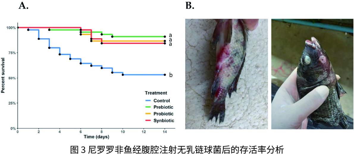 (7)低聚木糖对尼罗罗非鱼无乳链球菌抗性的影响与对照组相比,XOS组鱼类的存活率最高(P <0.05),其相对存活率(RPS)也最高,达 80.95。