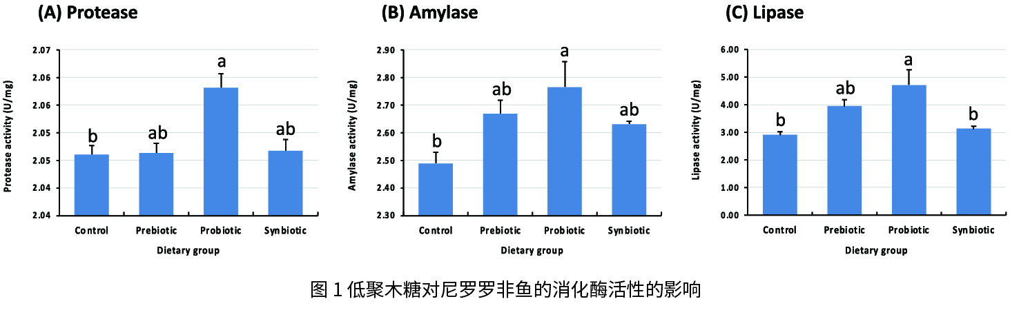 (5)低聚木糖对尼罗罗非鱼消化酶活性的影响 如图 1 所示,XOS组的尼罗罗非鱼的蛋白酶、淀粉酶和脂肪酶等消化酶的活性均显著升高(P < 0.05)。