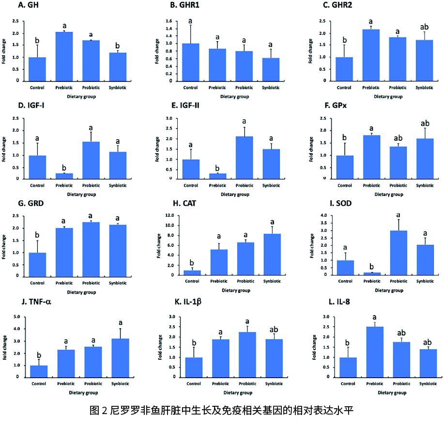 (6)低聚木糖对尼罗罗非鱼生长和免疫相关基因表达的影响 如图 2 所示,XOS 组显著升高了尼罗罗非鱼肝脏中生长激素受体 2(GHR2)、生长激素(GH)、谷胱甘肽还原酶(GRD)、过氧化氢酶(CAT)、肿瘤坏死因子 -α(TNF-α)、超氧化物歧化酶(SOD)、谷胱甘肽过氧化物酶(GPx)、白细胞介素 - 8(IL-8)及白细胞介素 - 1β(IL-1β)等基因的含量。